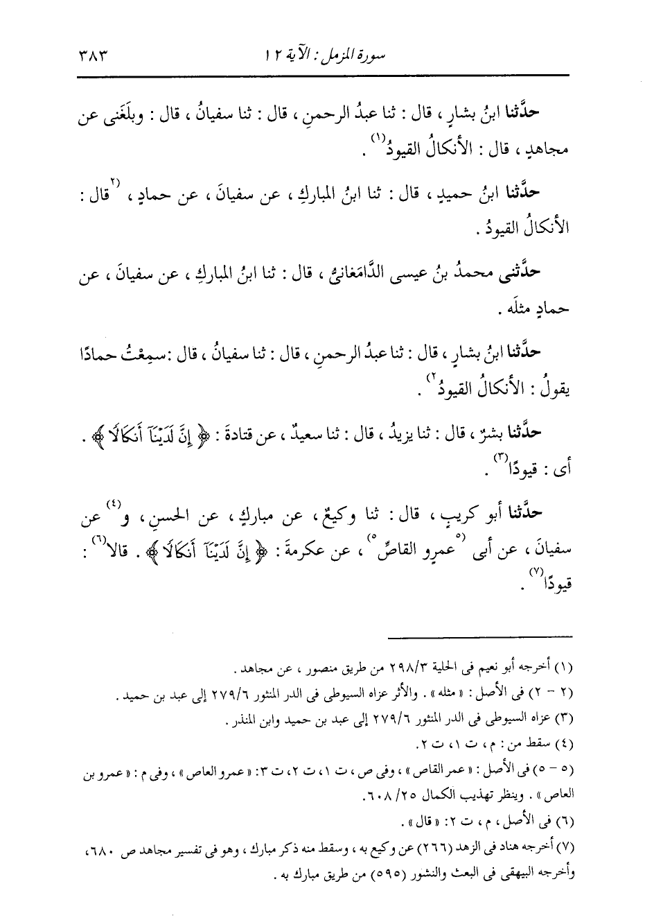 حَدَّثَنَا ابْنُ حُمَيْدٍ، قَالَ: ثنا ابْنُ الْمُبَارَكِ، عَنْ سُفْيَانَ، عَنْ حَمَّادٍ، قَالَ: §الْأَنْكَالُ الْقُيُودُ. حَدَّثَنِي مُحَمَّدُ بْنُ عِيسَى الدَّامِغَانِيُّ، قَالَ: ثنا ابْنُ الْمُبَارَكِ، عَنْ سُفْيَانَ، عَنْ حَمَّادٍ، مِثْلَهُ