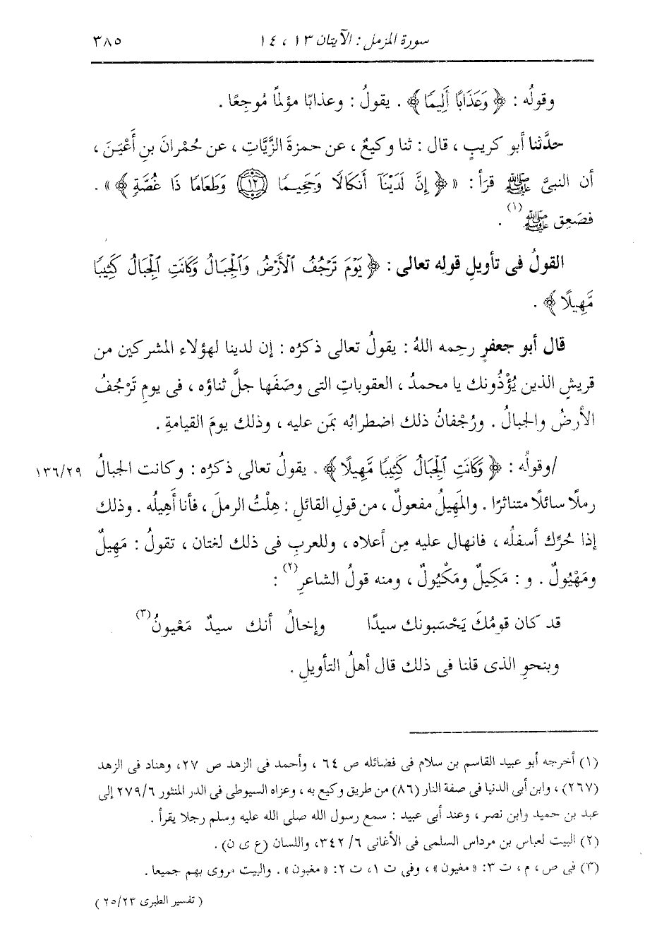 §الْقَوْلُ فِي تَأْوِيلِ قَوْلِهِ تَعَالَى: {يَوْمَ تَرْجُفُ الْأَرْضُ وَالْجِبَالُ وَكَانَتِ الْجِبَالُ كَثِيبًا مَهِيلًا} [المزمل: 14] يَقُولُ تَعَالَى ذِكْرُهُ: إِنَّ لَدَيْنَا لِهَؤُلَاءِ الْمُشْرِكِينَ مِنْ قُرَيْشٍ الَّذِينَ يُؤْذُونَكَ يَا مُحَمَّدُ الْعُقُوبَاتِ الَّتِي وَصَفَهَا فِي يَوْمٍ تَرْجُفُ الْأَرْضُ وَالْجِبَالُ؛ وَرُجْفَانُ ذَلِكَ: اضْطِرَابُهُ بِمَنْ عَلَيْهِ، وَذَلِكَ يَوْمُ الْقِيَامَةِ.