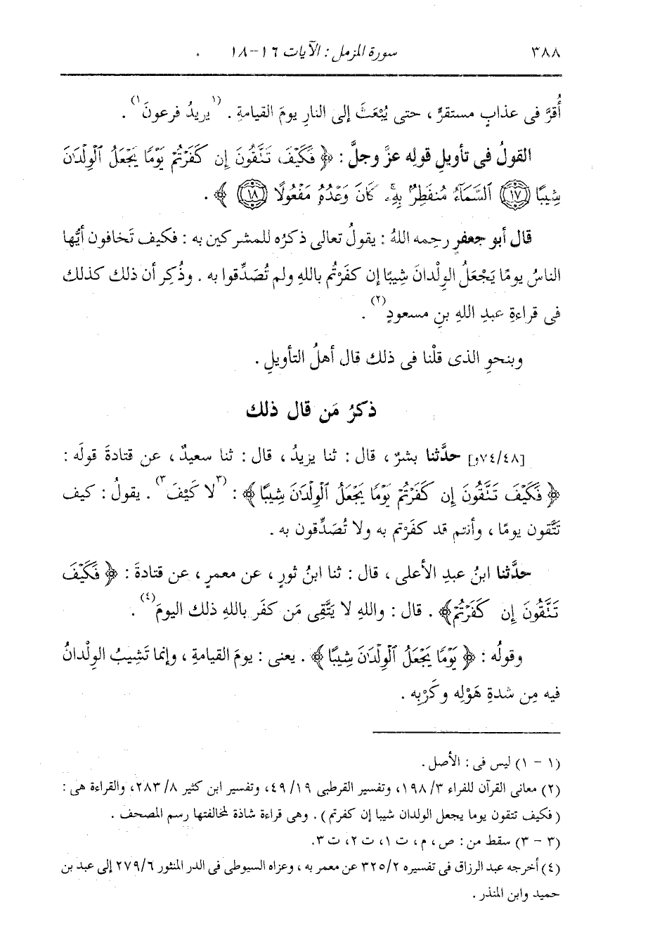 §الْقَوْلُ فِي تَأْوِيلِ قَوْلِهِ تَعَالَى: {فَكَيْفَ تَتَّقُونَ إِنْ كَفَرْتُمْ يَوْمًا يَجْعَلُ الْوِلْدَانَ شِيبًا السَّمَاءُ مُنْفَطِرٌ بِهِ كَانَ وَعْدُهُ مَفْعُولًا} [المزمل: 18] يَقُولُ تَعَالَى ذِكْرُهُ لِلْمُشْرِكِينَ بِهِ: فَكَيْفَ تَخَافُونَ أَيُّهَا النَّاسُ يَوْمًا يَجْعَلُ الْوِلْدَانَ شِيبًا إِنْ كَفَرْتُمْ بِاللَّهِ، وَلَمْ تُصَدِّقُوا بِهِ. وَذُكِرَ أَنَّ ذَلِكَ كَذَلِكَ فِي قِرَاءَةِ عَبْدِ اللَّهِ بْنِ مَسْعُودٍ. وَبِنَحْوِ الَّذِي قُلْنَا فِي ذَلِكَ قَالَ أَهْلُ التَّأْوِيلِ.