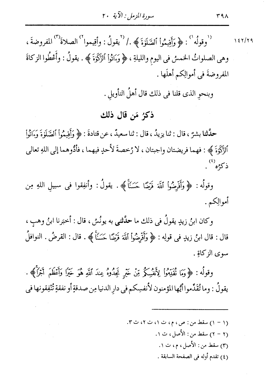 ذِكْرُ مَنْ قَالَ ذَلِكَ حَدَّثَنِي بِشْرٌ، قَالَ: ثنا يَزِيدُ، قَالَ: ثنا سَعِيدٌ، عَنْ قَتَادَةَ، {§وَأَقِيمُوا الصَّلَاةَ وَآتُوا الزَّكَاةَ} [المزمل: 20] فَهُمَا فَرِيضَتَانِ وَاجِبَتَانِ، لَا رُخْصَةَ لِأَحَدٍ فِيهِمَا، فَأَدُّوهُمَا إِلَى اللَّهِ تَعَالَى ذِكْرُهُ