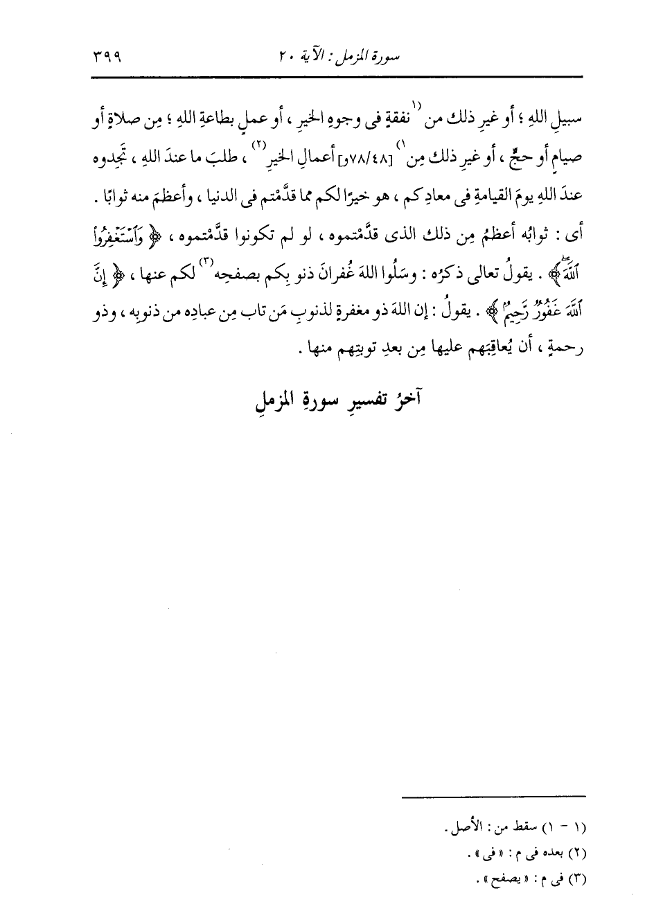 سَبِيلِ اللَّهِ، أَوْ غَيْرِ ذَلِكَ مِنْ نَفَقَةٍ فِي وُجُوهِ الْخَيْرِ، أَوْ عَمَلٍ بِطَاعَةِ اللَّهِ مِنْ صَلَاةٍ أَوْ صِيَامٍ أَوْ حَجٍّ، أَوْ غَيْرِ ذَلِكَ مِنْ أَعْمَالِ الْخَيْرِ فِي طَلَبِ مَا عِنْدَ اللَّهِ، تَجِدُوهُ عِنْدَ اللَّهِ يَوْمَ الْقِيَامَةِ فِي مَعَادِكُمْ، هُوَ خَيْرًا لَكُمْ مِمَّا قَدَّمْتُمْ فِي الدُّنْيَا، وَأَعْظَمُ مِنْهُ ثَوَابًا: أَيْ ثَوَابُهُ أَعْظَمُ مِنْ ذَلِكَ الَّذِي قَدَّمْتُمُوهُ لَوْ لَمْ تَكُونُوا قَدَّمْتُمُوهُ. {وَاسْتَغْفِرُوا اللَّهَ} [البقرة: 199] يَقُولُ تَعَالَى ذِكْرُهُ: وَسَلُوا اللَّهَ غُفْرَانَ ذُنُوبِكُمْ يَصْفَحْ لَكُمْ عَنْهَا. {إِنَّ اللَّهَ غَفُورٌ رَحِيمٌ} [البقرة: 173] يَقُولُ: إِنَّ اللَّهَ ذُو مَغْفِرَةٍ لِذُنُوبِ مَنْ تَابَ مِنْ عِبَادِهِ مِنْ ذُنُوبِهِ، وَذُو رَحْمَةٍ أَنْ يُعَاقِبَهُمْ عَلَيْهَا مِنْ بَعْدِ تَوْبَتِهِمْ مِنْهَا.