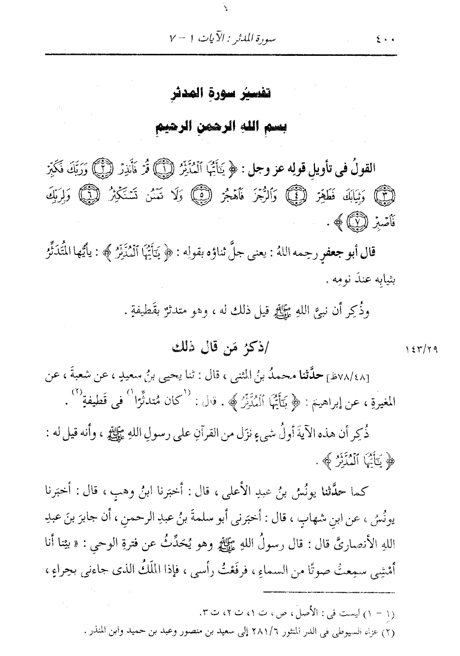 ذِكْرُ مَنْ قَالَ ذَلِكَ حَدَّثَنَا مُحَمَّدُ بْنُ الْمُثَنَّى، قَالَ: ثنا يَحْيَى بْنُ سَعِيدٍ، عَنْ شُعْبَةَ، عَنِ الْمُغِيرَةِ، عَنْ إِبْرَاهِيمَ، {يَا أَيُّهَا الْمُدَّثِّرُ} [المدثر: 1] قَالَ: كَانَ §مُتَدَثِّرًا فِي قَطِيفَةٍ وَذُكِرَ أَنَّ هَذِهِ الْآيَةَ أَوَّلُ شَيْءٍ نَزَلَ مِنَ الْقُرْآنِ عَلَى رَسُولِ اللَّهِ صَلَّى اللهُ عَلَيْهِ وَسَلَّمَ، وَأَنَّهُ قِيلَ لَهُ: {يَا أَيُّهَا الْمُدَّثِّرُ} [المدثر: 1]