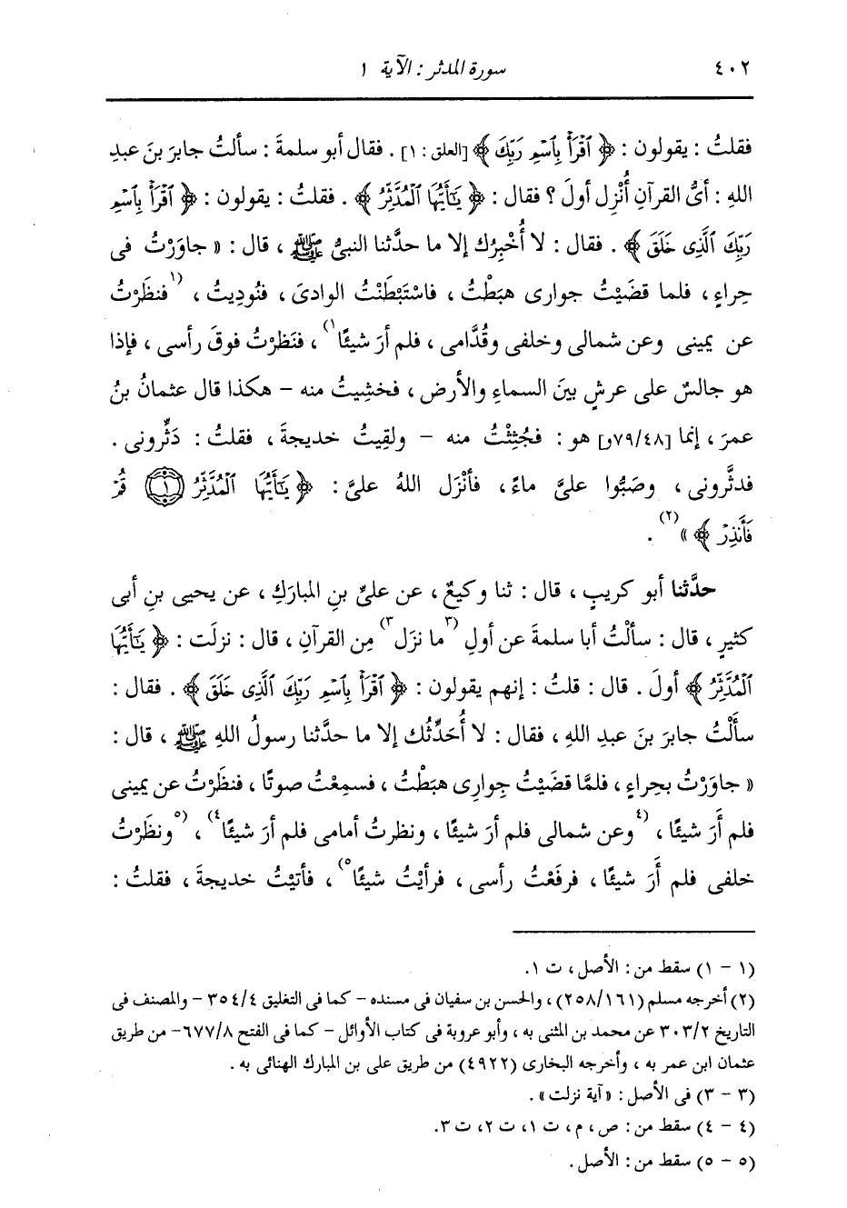 حَدَّثَنَا أَبُو كُرَيْبٍ، قَالَ: ثنا وَكِيعٌ، عَنْ عَلِيِّ بْنِ مُبَارَكٍ، عَنْ يَحْيَى بْنِ أَبِي كَثِيرٍ، قَالَ: سَأَلْتُ أَبَا سَلَمَةَ عَنْ أَوَّلِ مَا نَزَلَ مِنَ الْقُرْآنِ، قَالَ: نَزَلَتْ {يَا أَيُّهَا الْمُدَّثِّرُ} [المدثر: 1] أَوَّلَ؛ قَالَ: قُلْتُ: إِنَّهُمْ يَقُولُونَ {اقْرَأْ بِاسْمِ رَبِّكَ الَّذِي خَلَقَ} [العلق: 1] فَقَالَ: سَأَلْتُ جَابِرَ بْنَ عَبْدِ اللَّهِ، فَقَالَ: لَا أُحَدِّثُكَ إِلَّا مَا حَدَّثَنَا رَسُولُ اللَّهِ صَلَّى اللهُ عَلَيْهِ وَسَلَّمَ قَالَ: " جَاوَرْتُ بِحِرَاءٍ؛ فَلَمَّا قَضَيْتُ جِوَارِي هَبَطْتُ، فَسَمِعْتُ صَوْتًا، فَنَظَرْتُ عَنْ يَمِينِي فَلَمْ أَرَ شَيْئًا، وَنَظَرْتُ خَلْفِي فَلَمْ أَرَ شَيْئًا، فَرَفَعْتُ رَأْسِي فَرَأَيْتُ شَيْئًا، فَأَتَيْتُ خَدِيجَةَ، §فَقُلْتُ: -[403]- دَثِّرُونِي وَصُبُّوا عَلَيَّ مَاءً بَارِدًا، فَنَزَلَتْ {يَا أَيُّهَا الْمُدَّثِّرُ} [المدثر: 1]