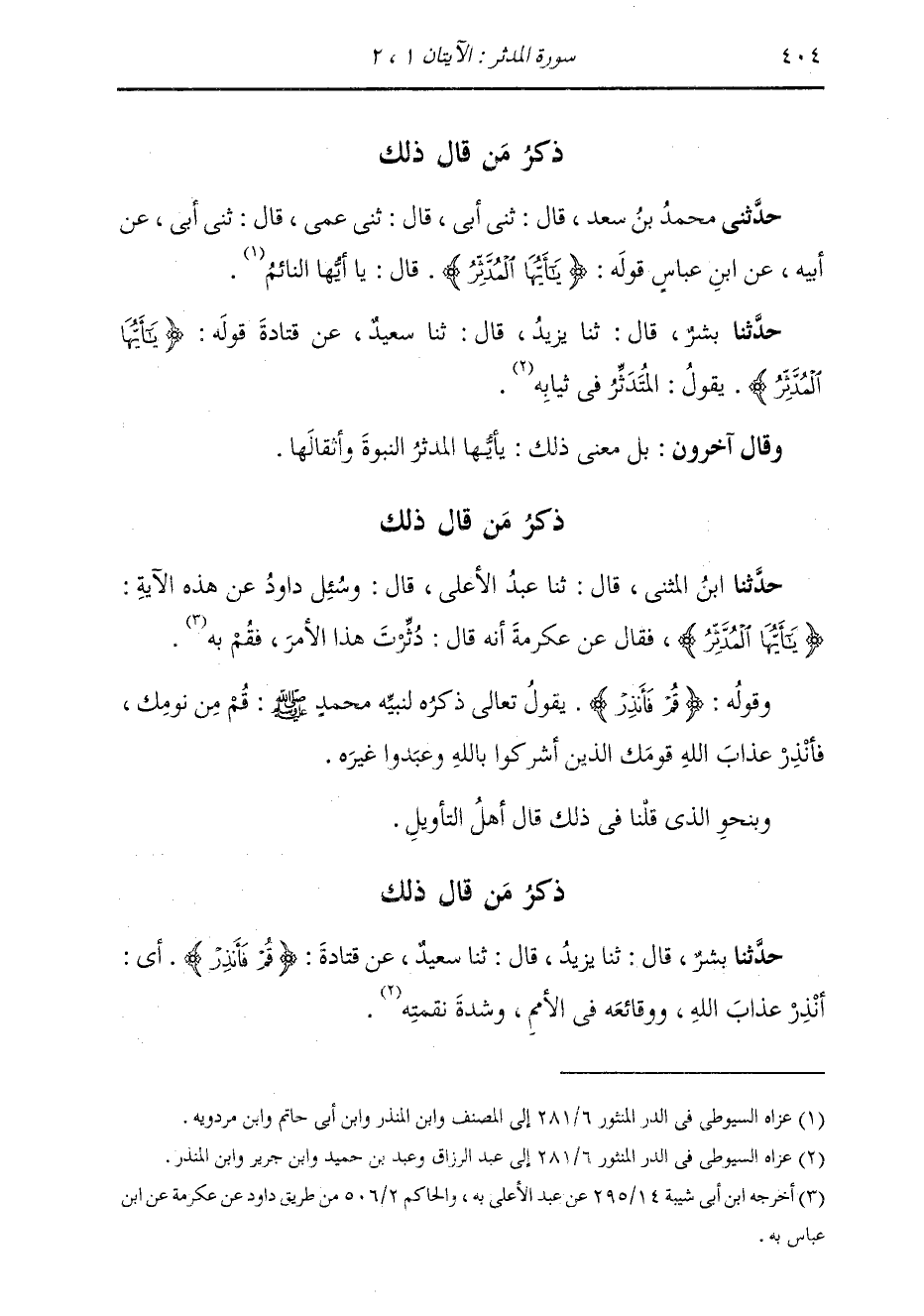 ذِكْرُ مَنْ قَالَ ذَلِكَ حَدَّثَنَا ابْنُ الْمُثَنَّى، قَالَ: ثنا عَبْدُ الْأَعْلَى، قَالَ: وَسُئِلَ دَاوُدُ عَنْ هَذِهِ الْآيَةِ: {يَا أَيُّهَا الْمُدَّثِّرُ} [المدثر: 1] فَحُدِّثْنَا عَنْ عِكْرِمَةَ أَنَّهُ قَالَ: §دُثِّرْتَ هَذَا الْأَمْرَ فَقُمْ بِهِ