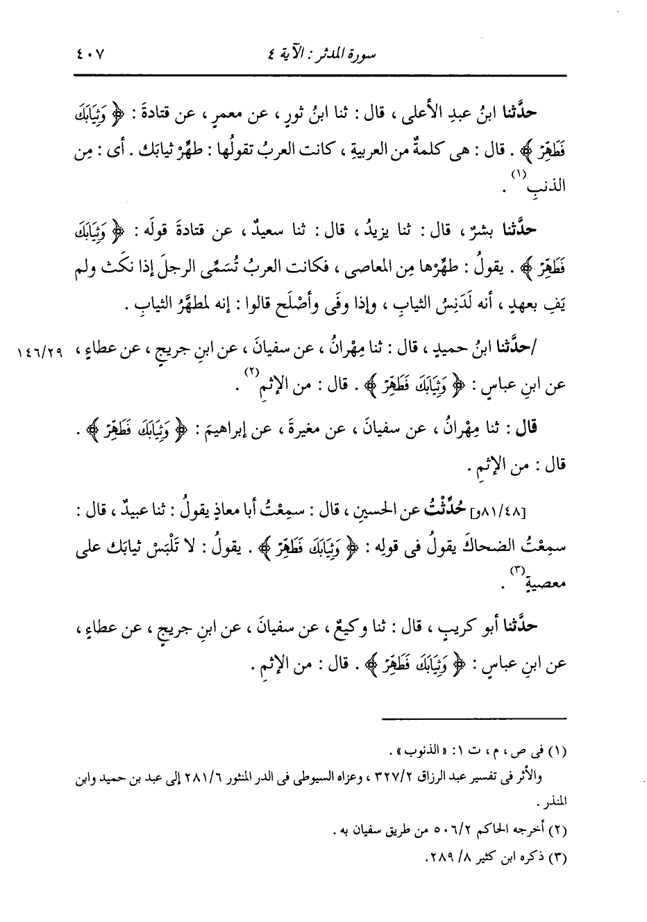 حَدَّثَنَا أَبُو كُرَيْبٍ، قَالَ: ثنا وَكِيعٌ، عَنْ سُفْيَانَ، عَنِ ابْنِ جُرَيْجٍ، عَنْ عَطَاءٍ، عَنِ ابْنِ عَبَّاسٍ {§وَثِيَابَكَ فَطَهِّرْ} [المدثر: 4] قَالَ: مِنَ الْإِثْمِ. -[408]- قَالَ ثنا وَكِيعٌ، عَنْ سُفْيَانَ، عَنْ مُغِيرَةَ، عَنْ إِبْرَاهِيمَ، قَالَ: مِنَ الْإِثْمِ. قَالَ: ثنا وَكِيعٌ، عَنْ سُفْيَانَ، عَنِ الْأَجْلَحِ، سَمِعَ عِكْرِمَةَ، قَالَ: لَا تَلْبَسْ ثِيَابَكَ عَلَى مَعْصِيَةٍ. قَالَ: ثنا وَكِيعٌ، عَنْ سُفْيَانَ، عَنْ جَابِرٍ، عَنْ عَامِرٍ وَعَطَاءٍ، قَالَا: مِنَ الْخَطَايَا وَقَالَ آخَرُونَ: بَلْ مَعْنَى ذَلِكَ: لَا تَلْبَسْ ثِيَابَكَ مِنْ مَكْسَبٍ غَيْرِ طَيِّبٍ