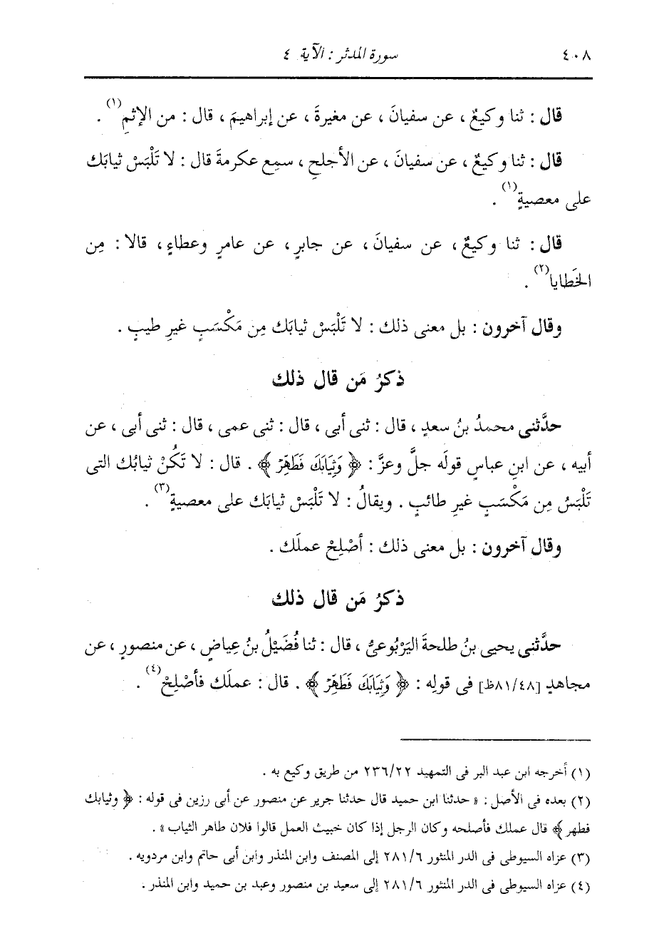ذِكْرُ مَنْ قَالَ ذَلِكَ حَدَّثَنِي مُحَمَّدُ بْنُ سَعْدٍ، قَالَ: ثني أَبِي، قَالَ: ثني عَمِّي، قَالَ: ثني أَبِي، عَنْ أَبِيهِ، عَنِ ابْنِ عَبَّاسٍ، {§وَثِيَابَكَ فَطَهِّرْ} [المدثر: 4] قَالَ: لَا تَكُنْ ثِيَابَكَ الَّتِي تَلْبَسُ مِنْ مَكْسَبٍ غَيْرِ طَائِبٍ، وَيُقَالُ: لَا تَلْبَسْ ثِيَابَكَ عَلَى مَعْصِيَةٍ وَقَالَ آخَرُونَ: بَلْ مَعْنَى ذَلِكَ: أَصْلِحْ عَمَلَكَ