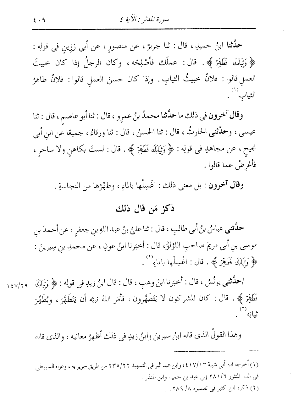 ذِكْرُ مَنْ قَالَ ذَلِكَ حَدَّثَنِي عَبَّاسُ بْنُ أَبِي طَالِبٍ، قَالَ: ثنا عَلِيُّ بْنُ عَبْدِ اللَّهِ بْنِ جَعْفَرٍ، عَنْ أَحْمَدَ بْنِ مُوسَى بْنِ أَبِي مَرْيَمَ، صَاحِبِ اللُّؤْلُؤِ، قَالَ: أَخْبَرَنَا ابْنُ عَوْنٍ، عَنْ مُحَمَّدِ بْنِ سِيرِينَ، {§وَثِيَابَكَ فَطَهِّرْ} [المدثر: 4] قَالَ: اغْسِلْهَا بِالْمَاءِ