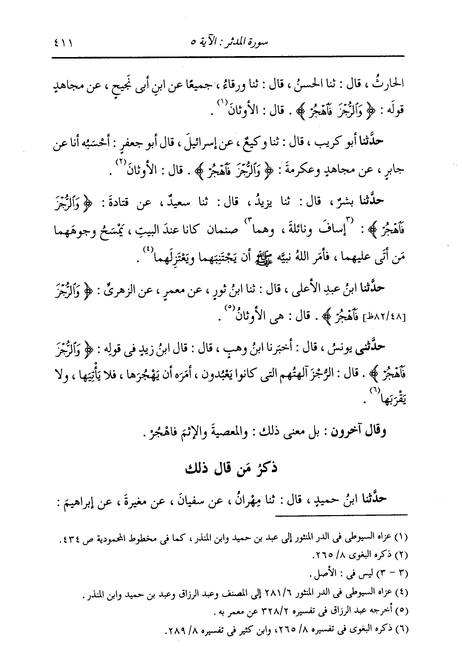 ذِكْرُ مَنْ قَالَ ذَلِكَ حَدَّثَنَا ابْنُ حُمَيْدٍ، قَالَ: ثنا مِهْرَانُ، عَنْ سُفْيَانَ، عَنْ مُغِيرَةَ، عَنْ إِبْرَاهِيمَ -[412]-، {§وَالرُّجْزَ فَاهْجُرْ} [المدثر: 5] قَالَ الْإِثْمُ