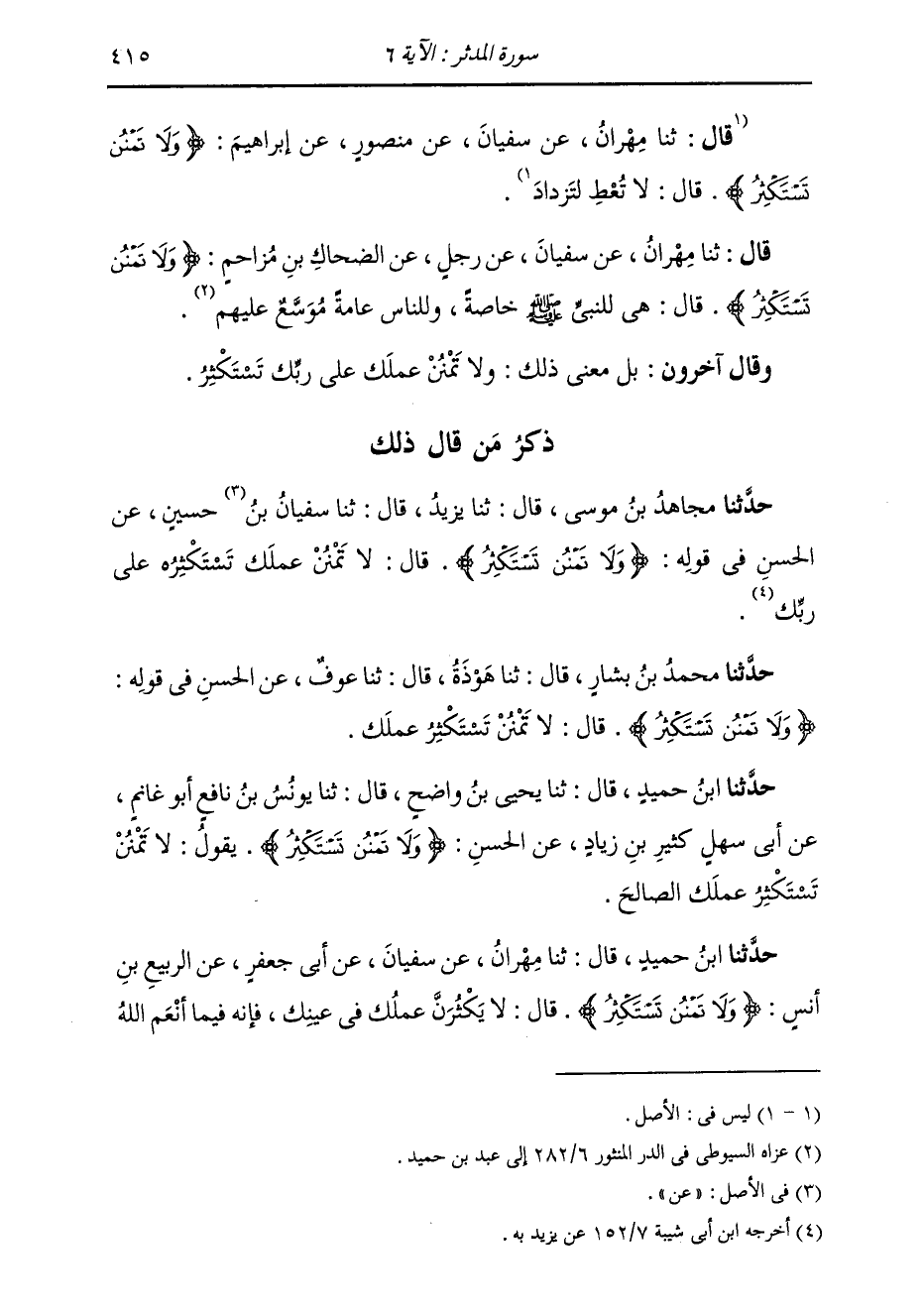 قَالَ: ثنا مِهْرَانُ، عَنْ سُفْيَانَ، عَنْ مَنْصُورٍ، عَنْ إِبْرَاهِيمَ {§وَلَا تَمْنُنْ تَسْتَكْثِرُ} [المدثر: 6] قَالَ: لَا تُعْطِ لِتَزْدَادَ