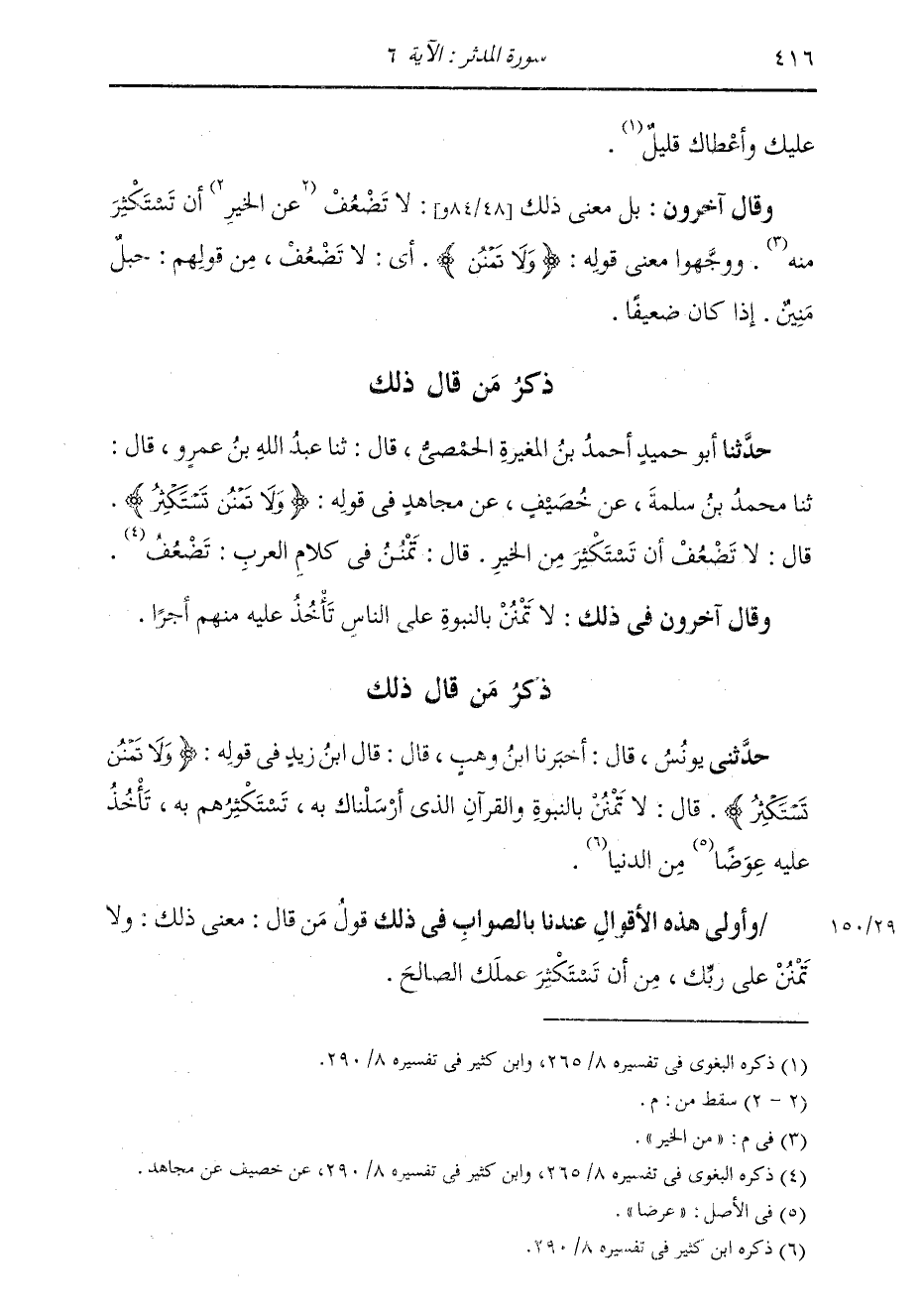ذِكْرُ مَنْ قَالَ ذَلِكَ حَدَّثَنَا أَبُو حُمَيْدِ بْنُ الْمُغِيرَةِ الْحِمْصِيُّ، قَالَ: ثنا عَبْدُ اللَّهِ بْنُ عَمْرٍو، قَالَ: ثنا مُحَمَّدُ بْنُ سَلَمَةَ، عَنْ خُصَيْفٍ، عَنْ مُجَاهِدٍ، فِي قَوْلِهِ: {§وَلَا تَمْنُنْ تَسْتَكْثِرُ} [المدثر: 6] قَالَ: لَا تَضْعَفْ أَنْ تَسْتَكْثِرَ مِنَ الْخَيْرِ، قَالَ: تَمْنُنْ فِي كَلَامِ الْعَرَبِ: تَضْعَفُ وَقَالَ آخَرُونَ فِي ذَلِكَ: لَا تَمْنُنْ بِالنُّبُوَّةِ عَلَى النَّاسِ، تَأْخُذُ عَلَيْهِ مِنْهُمْ أَجْرًا