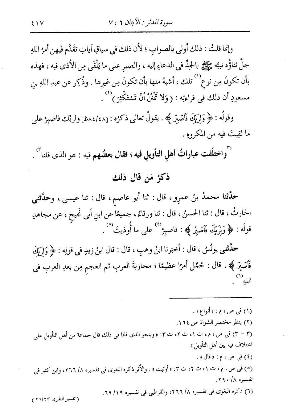 §وَقَوْلُهُ: {وَلِرَبِّكَ فَاصْبِرْ} [المدثر: 7] يَقُولُ تَعَالَى ذِكْرُهُ: وَلِرَبِّكَ فَاصْبِرْ عَلَى مَا لَقِيتَ فِيهِ مِنَ الْمَكْرُوهِ. وَبِنَحْوِ الَّذِي قُلْنَا فِي ذَلِكَ قَالَ جَمَاعَةٌ مِنْ أَهْلِ التَّأْوِيلِ عَلَى اخْتِلَافٍ فِيهِ بَيْنَ أَهْلِ التَّأْوِيلِ.