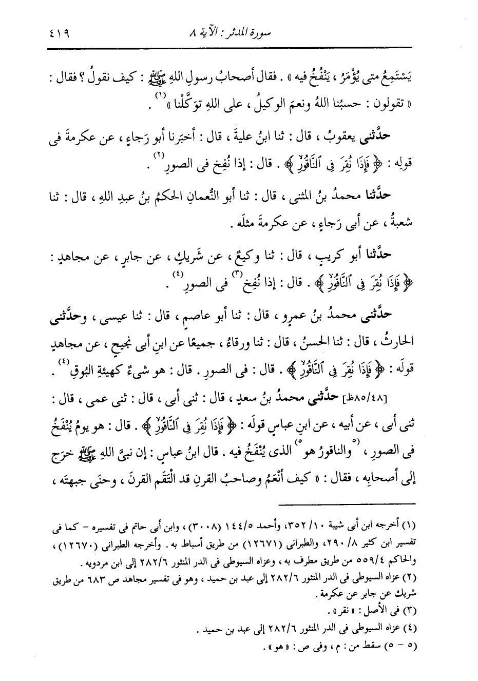 حَدَّثَنِي يَعْقُوبُ، قَالَ: ثنا ابْنُ عُلَيَّةَ، قَالَ: أَخْبَرَنَا أَبُو رَجَاءٍ، عَنْ عِكْرِمَةَ، فِي قَوْلِهِ: {§فَإِذَا نُقِرَ فِي النَّاقُورِ} [المدثر: 8] قَالَ: إِذَا نُفِخَ فِي الصُّورِ. حَدَّثَنَا مُحَمَّدُ بْنُ الْمُثَنَّى، قَالَ: ثنا أَبُو النُّعْمَانِ الْحَكَمُ بْنُ عَبْدِ اللَّهِ، قَالَ: ثنا شُعْبَةُ، عَنْ أَبِي رَجَاءٍ، عَنْ عِكْرِمَةَ، فِي قَوْلِهِ: {فَإِذَا نُقِرَ فِي النَّاقُورِ} [المدثر: 8] مِثْلَهُ