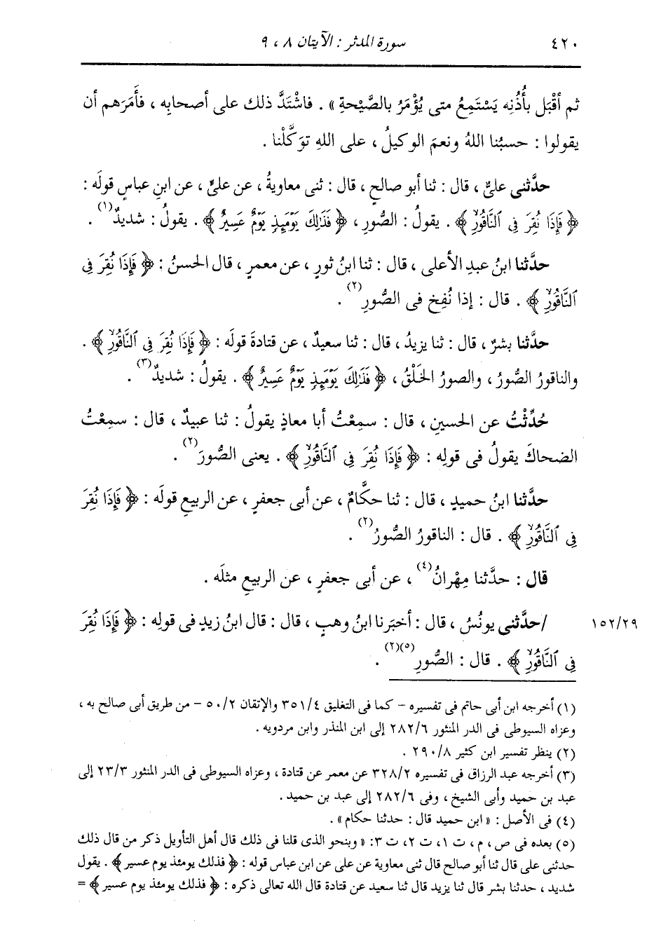حَدَّثَنِي عَلِيٌّ، قَالَ: ثنا أَبُو صَالِحٍ، قَالَ: ثني مُعَاوِيَةُ، عَنْ عَلِيٍّ، عَنِ ابْنِ عَبَّاسٍ، قَوْلُهُ {§فَإِذَا نُقِرَ فِي النَّاقُورِ} [المدثر: 8] يَقُولُ: الصُّورِ