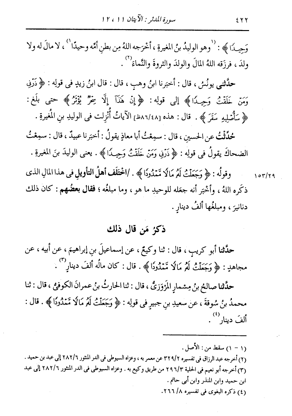 ذِكْرُ مَنْ قَالَ ذَلِكَ حَدَّثَنَا أَبُو كُرَيْبٍ، قَالَ: ثنا وَكِيعٌ، عَنْ إِسْمَاعِيلَ بْنِ إِبْرَاهِيمَ، عَنْ أَبِيهِ، عَنْ مُجَاهِدٍ: {§وَجَعَلْتُ لَهُ مَالًا مَمْدُودًا} [المدثر: 12] قَالَ: كَانَ مَالُهُ أَلْفَ دِينَارٍ