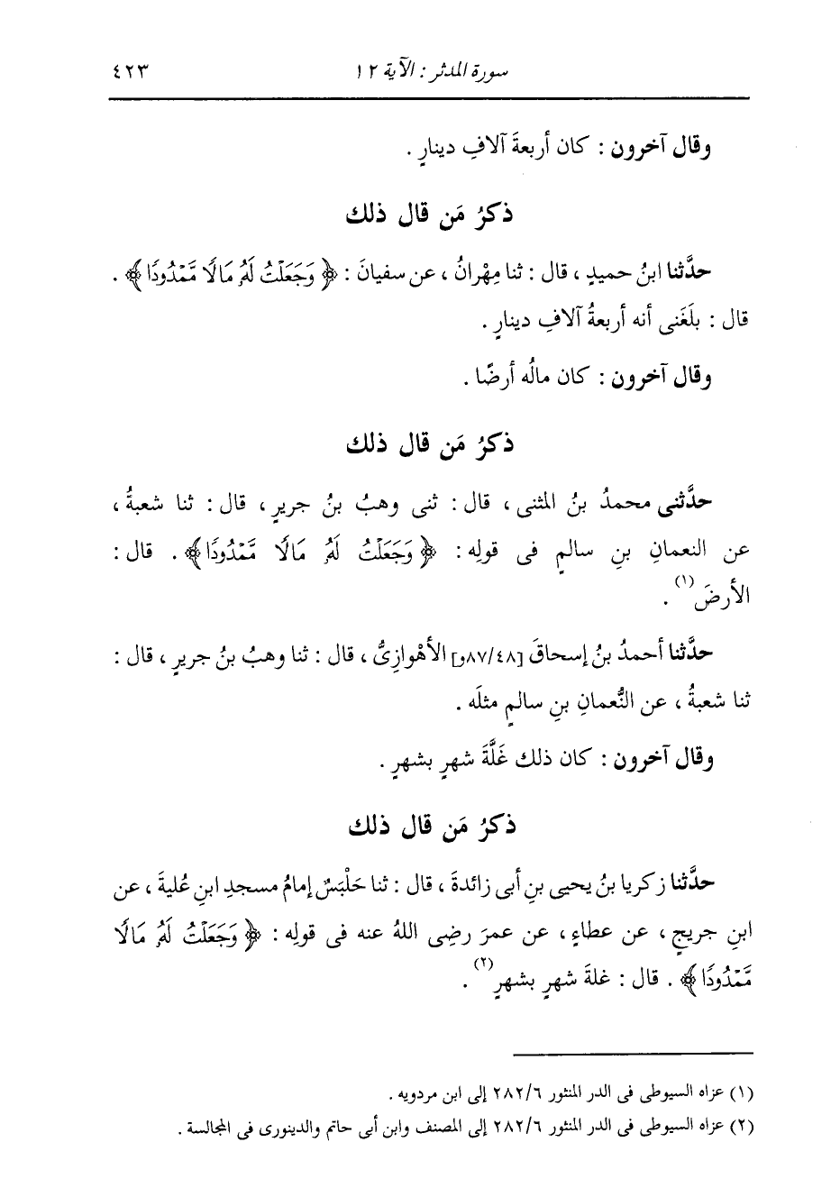 ذِكْرُ مَنْ قَالَ ذَلِكَ حَدَّثَنِي مُحَمَّدُ بْنُ الْمُثَنَّى، قَالَ: ثني وَهْبُ بْنُ جَرِيرٍ، قَالَ: ثنا شُعْبَةُ، عَنِ النُّعْمَانِ بْنِ سَالِمٍ، فِي قَوْلِهِ: {§وَجَعَلْتُ لَهُ مَالًا مَمْدُودًا} [المدثر: 12] قَالَ: الْأَرْضَ. حَدَّثَنَا أَحْمَدُ بْنُ إِسْحَاقَ الْأَهْوَازِيُّ، قَالَ: ثنا وَهْبُ بْنُ جَرِيرٍ، قَالَ: ثنا شُعْبَةُ، عَنِ النُّعْمَانِ بْنِ سَالِمٍ مِثْلَهُ وَقَالَ آخَرُونَ: كَانَ ذَلِكَ غَلَّةَ شَهْرٍ بِشَهْرٍ
