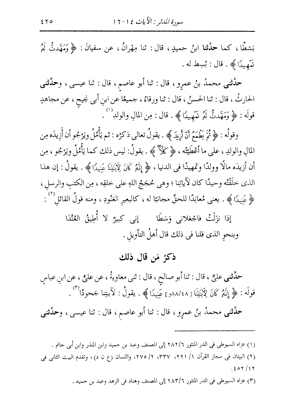 ذِكْرُ مَنْ قَالَ ذَلِكَ حَدَّثَنِي عَلِيٌّ، قَالَ: ثنا أَبُو صَالِحٍ، قَالَ: ثني مُعَاوِيَةُ، عَنْ عَلِيٍّ، عَنِ ابْنِ عَبَّاسٍ، قَوْلُهُ: {§إِنَّهُ كَانَ لِآيَاتِنَا عَنِيدًا} [المدثر: 16] قَالَ: جُحُودًا