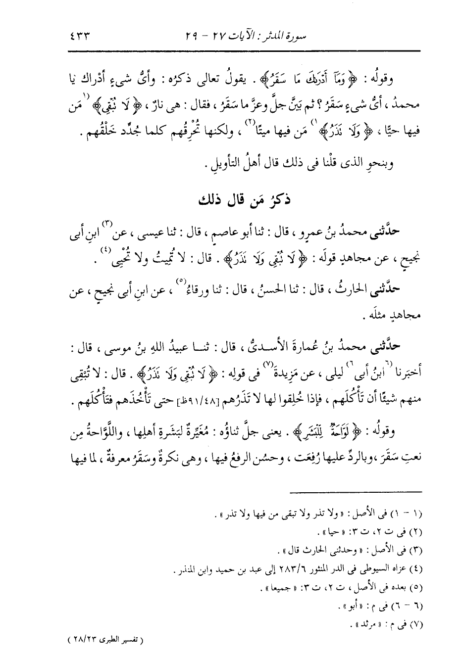 ذِكْرُ مَنْ قَالَ ذَلِكَ حَدَّثَنِي مُحَمَّدُ بْنُ عَمْرٍو، قَالَ: ثنا أَبُو عَاصِمٍ، قَالَ: ثنا عِيسَى، عَنِ ابْنِ أَبِي نَجِيحٍ، عَنْ مُجَاهِدٍ، قَوْلُهُ: {§لَا تُبْقِي وَلَا تَذَرُ} [المدثر: 28] قَالَ: لَا تُمِيتُ وَلَا تُحْيِي. حَدَّثَنِي الْحَارِثُ، قَالَ: ثنا الْحَسَنُ، قَالَ: ثنا وَرْقَاءُ، عَنِ ابْنِ أَبِي نَجِيحٍ، عَنْ مُجَاهِدٍ، مِثْلَهُ