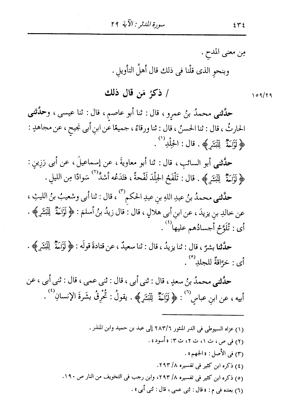 ذِكْرُ مَنْ قَالَ ذَلِكَ حَدَّثَنَا مُحَمَّدُ بْنُ عَمْرٍو، قَالَ: ثنا أَبُو عَاصِمٍ، قَالَ: ثنا عِيسَى،؛ وَحَدَّثَنِي الْحَارِثُ، قَالَ: ثنا الْحَسَنُ، قَالَ: ثنا وَرْقَاءُ، جَمِيعًا عَنِ ابْنِ أَبِي نَجِيحٍ، عَنْ مُجَاهِدٍ، {§لَوَّاحَةً لِلْبَشَرِ} [المدثر: 29] قَالَ: الْجِلْدُ