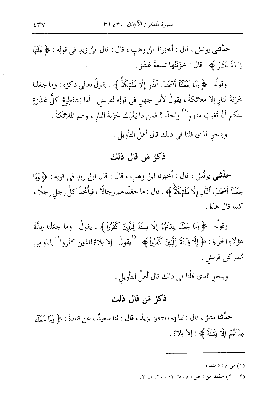 ذِكْرُ مَنْ قَالَ ذَلِكَ حَدَّثَنَا بِشْرٌ، قَالَ: ثنا يَزِيدُ، قَالَ: ثنا سَعِيدٌ، عَنْ قَتَادَةَ، {§وَمَا جَعَلْنَا عِدَّتَهُمْ إِلَّا فِتْنَةً لِلَّذِينَ كَفَرُوا} [المدثر: 31] إِلَّا بَلَاءً -[438]- وَإِنَّمَا جَعَلَ اللَّهُ الْخَبَرَ عَنْ عِدَّةِ خَزَنَةِ جَهَنَّمَ فِتْنَةً لِلَّذِينَ كَفَرُوا، لِتَكْذِيبِهِمْ بِذَلِكَ، وَقَوْلِ بَعْضِهِمْ لِأَصْحَابِهِ: أَنَا أَكْفِيكُمُوهُمْ