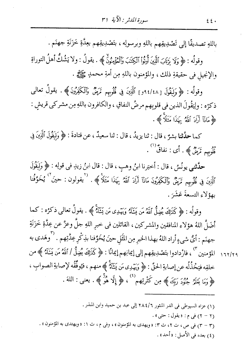 §وَقَوْلُهُ: {كَذَلِكَ يُضِلُّ اللَّهُ مَنْ يَشَاءُ وَيَهْدِي مَنْ يَشَاءُ} [المدثر: 31] يَقُولُ تَعَالَى ذِكْرُهُ: كَمَا أَضَلَّ اللَّهُ هَؤُلَاءِ الْمُنَافِقِينَ وَالْمُشْرِكِينَ الْقَائِلِينَ فِي خَبَرِ اللَّهِ عَنْ عِدَّةِ خَزَنَةِ جَهَنَّمَ: أَيُّ شَيْءٍ أَرَادَ اللَّهُ بِهَذَا الْخَبَرِ مِنَ الْمَثَلِ حَتَّى يُخَوِّفُنَا بِذِكْرِ عِدَّتِهِمْ، وَيَهْتَدِي بِهِ الْمُؤْمِنُونِ، فَازْدَادُوا بِتَصْدِيقِهِمْ إِلَى إِيمَانِهِمْ إِيمَانًا {كَذَلِكَ يُضِلُّ اللَّهُ مَنْ يَشَاءُ} [المدثر: 31] مِنْ خَلْقِهِ فَيَخْذُلُهُ عَنْ إِصَابَةِ الْحَقِّ {وَيَهْدِي مَنْ يَشَاءُ} [يونس: 25] مِنْهُمْ، فَيُوَفِّقُهُ لِإِصَابَةِ الصَّوَابِ. {وَمَا يَعْلَمُ جُنُودَ رَبِّكَ} [المدثر: 31] مِنْ كَثْرَتِهِمْ {إِلَّا هُوَ} [البقرة: 163] يَعْنِي اللَّهَ.