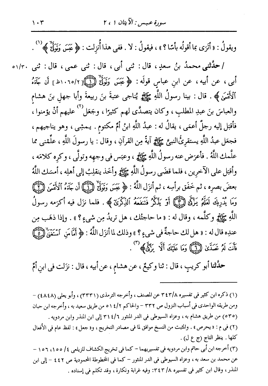 حَدَّثَنَا أَبُو كُرَيْبٍ، قَالَ: ثنا وَكِيعٌ، عَنْ هِشَامٍ، عَنْ أَبِيهِ، قَالَ: §نَزَلَتْ فِي ابْنِ أُمِّ -[104]- مَكْتُومٍ {عَبَسَ وَتَوَلَّى أَنْ جَاءَهُ الْأَعْمَى} [عبس: 2]