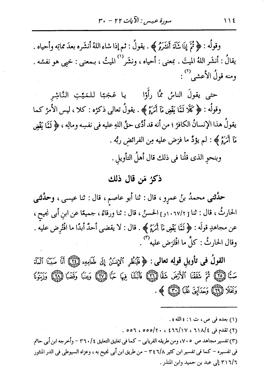 ذِكْرُ مَنْ قَالَ ذَلِكَ: حَدَّثَنِي مُحَمَّدُ بْنُ عَمْرٍو، قَالَ: ثنا أَبُو عَاصِمٍ، قَالَ: ثنا عِيسَى، وَحَدَّثَنِي الْحَارِثُ، قَالَ: ثنا الْحَسَنُ، قَالَ: ثنا وَرْقَاءُ، جَمِيعًا عَنِ ابْنِ أَبِي نَجِيحٍ، عَنْ مُجَاهِدٍ، قَوْلُهُ: {§لَمَّا يَقْضِ مَا أَمَرَهُ} [عبس: 23] قَالَ: لَا يَقْضِي أَحَدٌ أَبَدًا مَا افْتَرَضَ عَلَيْهِ. وَقَالَ الْحَارِثُ: كُلَّ مَا افْتَرَضَ عَلَيْهِ