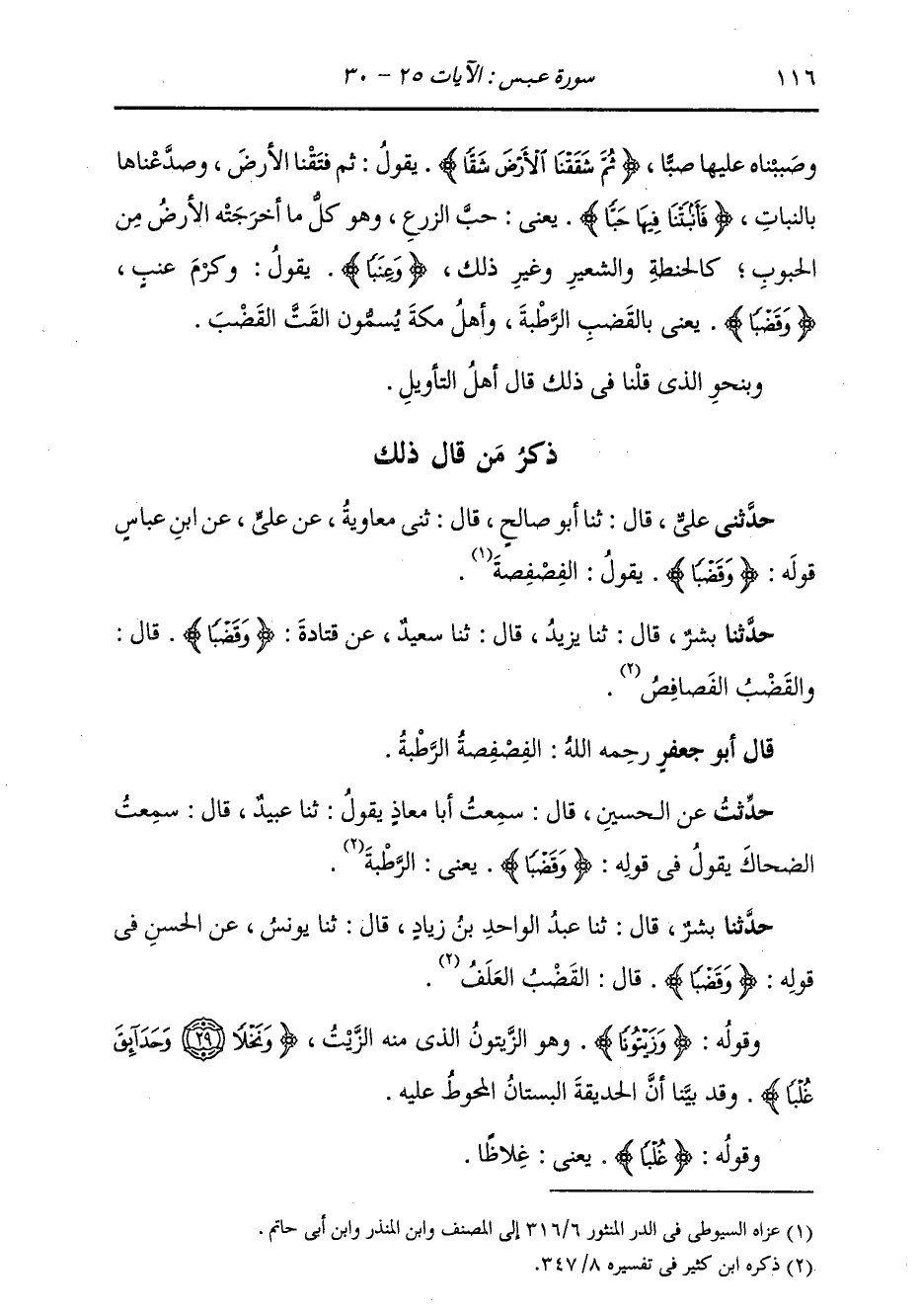 ذِكْرُ مَنْ قَالَ ذَلِكَ: حَدَّثَنِي عَلِيٌّ، قَالَ: ثنا أَبُو صَالِحٍ، قَالَ: ثني مُعَاوِيَةُ، عَنْ عَلِيٍّ، عَنِ ابْنِ عَبَّاسٍ، قَوْلُهُ: {§وَقَضْبًا} [عبس: 28] يَقُولُ: الْفِصْفِصَةُ