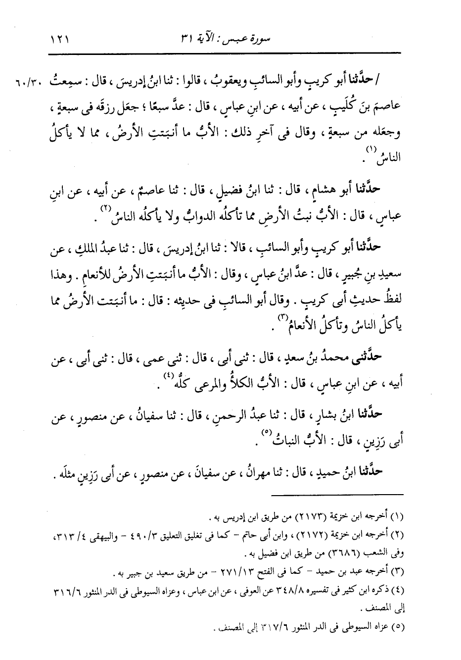 حَدَّثَنَا أَبُو كُرَيْبٍ، وَأَبُو السَّائِبِ، قَالَا: ثنا ابْنُ إِدْرِيسَ، قَالَ: ثنا عَبْدُ الْمَلِكِ، عَنْ سَعِيدِ بْنِ جُبَيْرٍ، قَالَ: عَدَّ ابْنُ عَبَّاسٍ، وَقَالَ: §الْأَبُّ: مَا أَنْبَتَتِ الْأَرْضُ لِلْأَنْعَامِ وَهَذَا لَفْظُ حَدِيثِ أَبِي كُرَيْبٍ وَقَالَ أَبُو السَّائِبِ فِي حَدِيثِهِ، قَالَ: مَا أَنْبَتَتِ الْأَرْضُ مِمَّا يَأْكُلُ النَّاسُ وَتَأْكُلُ الْأَنْعَامُ