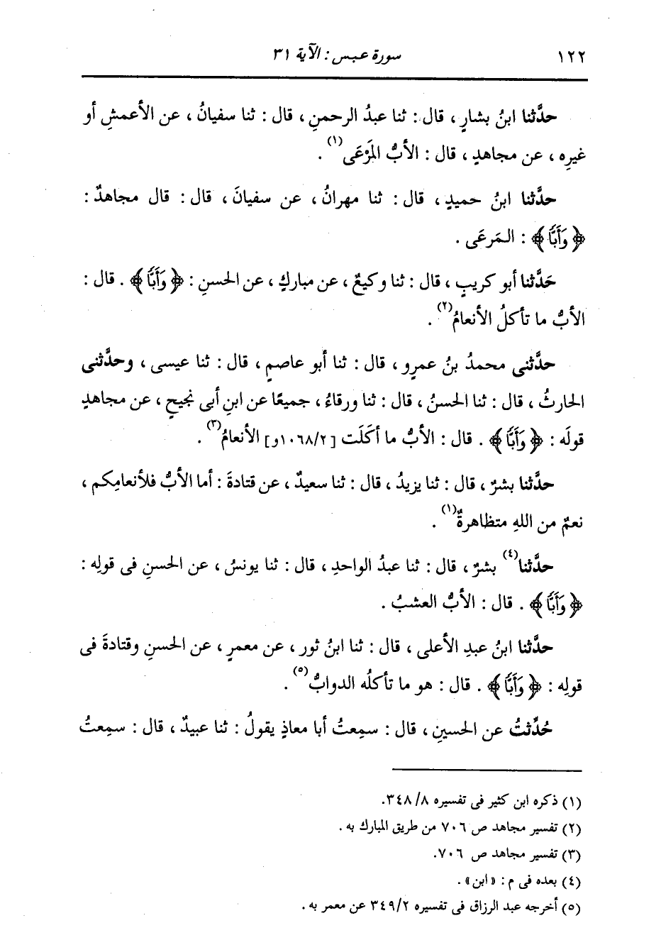 حَدَّثَنَا ابْنُ بَشَّارٍ، قَالَ: ثنا عَبْدُ الرَّحْمَنِ، قَالَ: ثنا سُفْيَانُ، عَنِ الْأَعْمَشِ، أَوْ غَيْرِهِ، عَنْ مُجَاهِدٍ، قَالَ: §الْأَبُّ: الْمَرْعَى