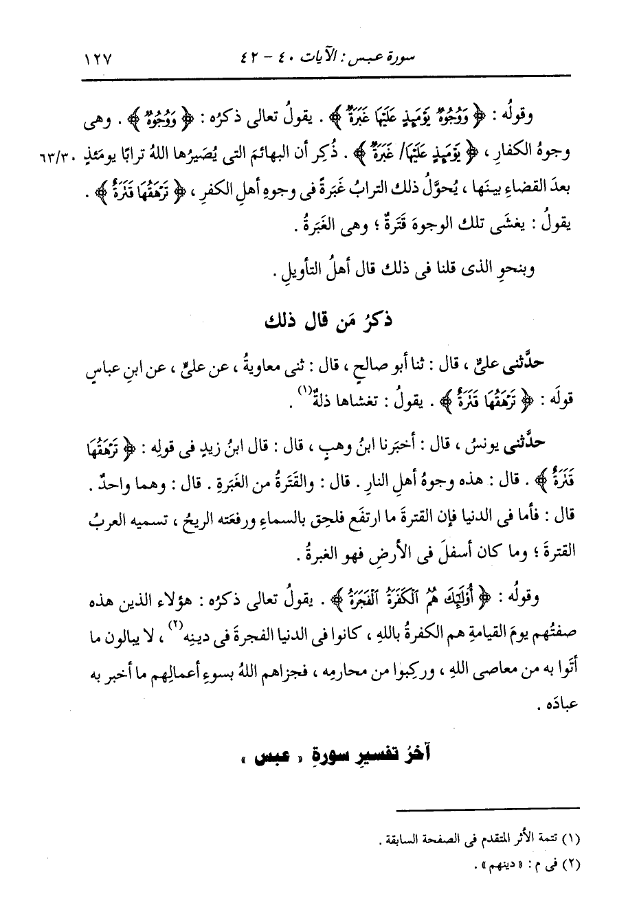 ذِكْرُ مَنْ قَالَ ذَلِكَ: حَدَّثَنِي عَلِيٌّ، قَالَ: ثنا أَبُو صَالِحٍ، قَالَ: ثني مُعَاوِيَةُ، عَنْ عَلِيٍّ، عَنِ ابْنِ عَبَّاسٍ، قَوْلُهُ: {§تَرْهَقُهَا قَتَرَةٌ} [عبس: 41] يَقُولُ: تَغْشَاهَا ذِلَّةٌ