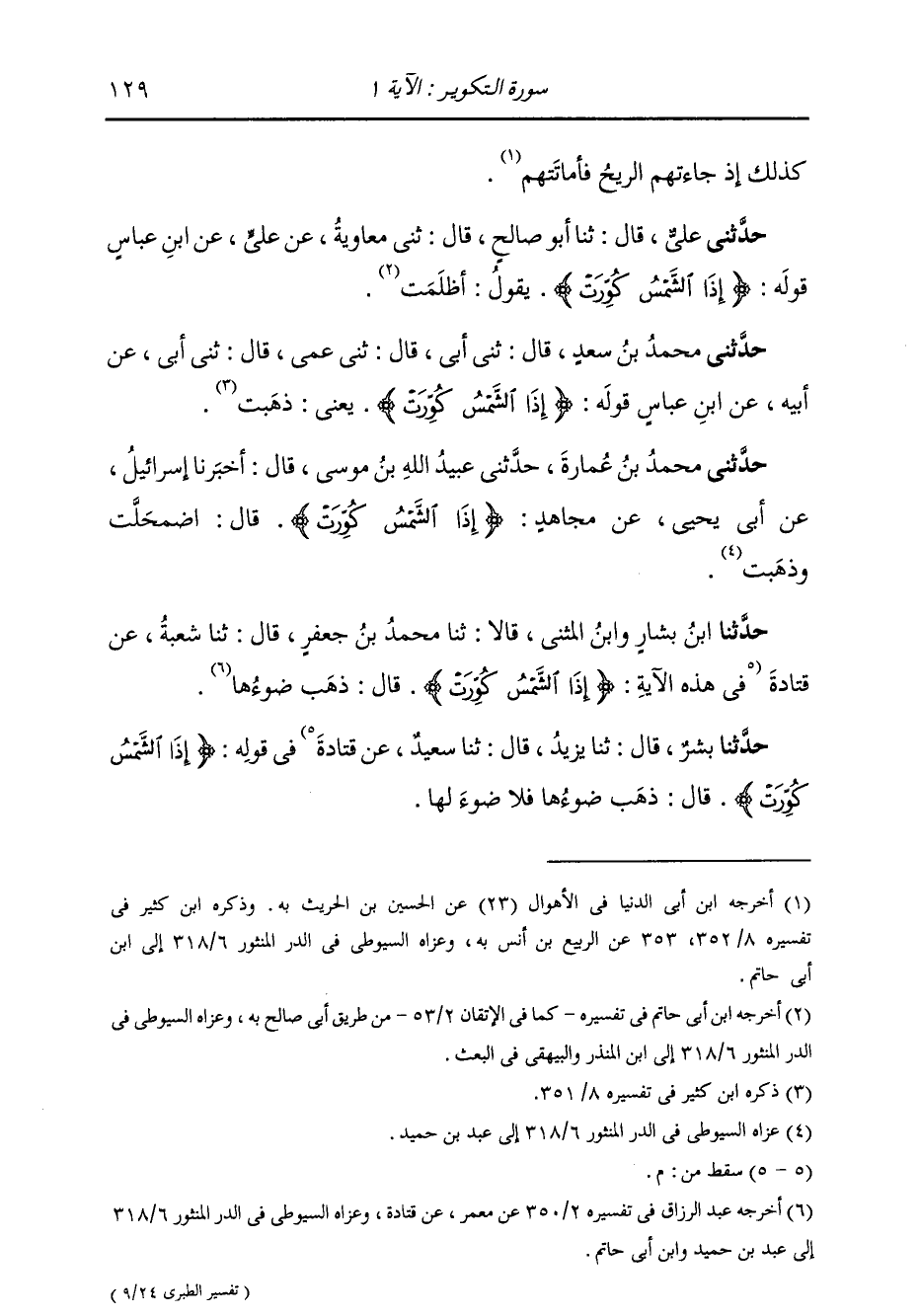 حَدَّثَنِي مُحَمَّدُ بْنُ سَعْدٍ، قَالَ: ثني أَبِي، قَالَ: ثني عَمِّي، قَالَ: ثني أَبِي، عَنْ أَبِيهِ، عَنِ ابْنِ عَبَّاسٍ، قَوْلُهُ {§إِذَا الشَّمْسُ كُوِّرَتْ} [التكوير: 1] يَعْنِي: ذَهَبَتْ