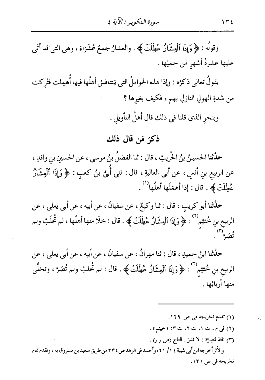 §قَوْلُهُ: {وَإِذَا الْعِشَارُ عُطِّلَتْ} [التكوير: 4] وَالْعِشَارُ: جَمْعُ عُشَرَاءَ، وَهِيَ الَّتِي قَدْ أَتَى عَلَيْهَا عَشَرَةُ أَشْهُرٍ مِنْ حَمْلِهَا. يَقُولُ تَعَالَى ذِكْرُهُ: وَإِذَا هَذِهِ الْحَوَامِلُ الَّتِي يَتَنَافَسُ أَهْلُهَا فِيهَا أُهْمِلَتْ فَتُرِكَتْ، مِنْ شِدَّةِ الْهَوْلِ النَّازِلِ بِهِمْ، فَكَيْفَ بِغَيْرِهَا وَبِنَحْوِ الَّذِي قُلْنَا فِي ذَلِكَ قَالَ أَهْلُ الْتَأْوِيلِ