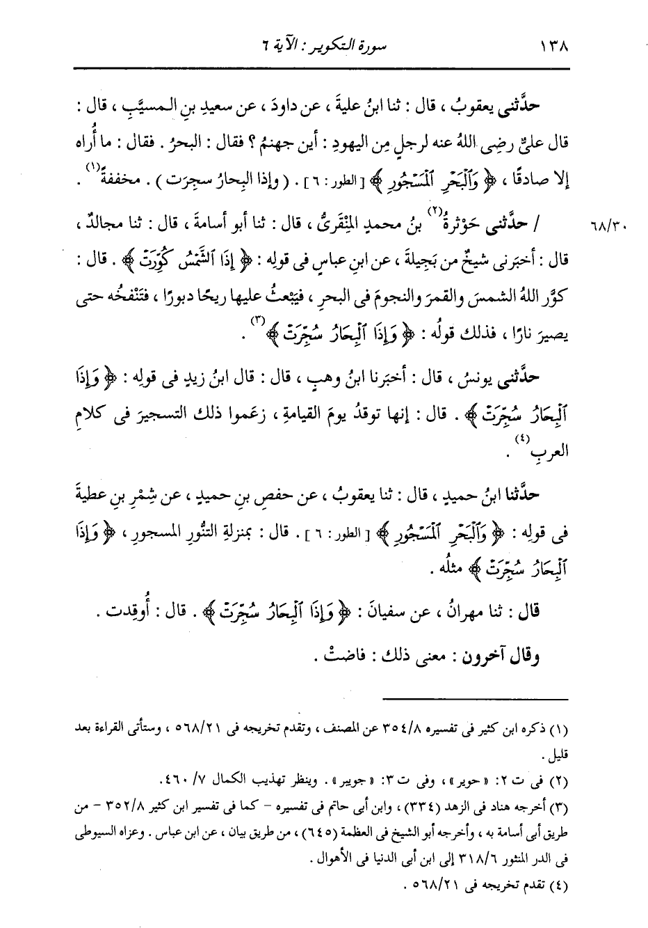 قَالَ: ثنا مِهْرَانُ، عَنْ سُفْيَانَ، {§وَإِذَا الْبِحَارُ سُجِّرَتْ} [التكوير: 6] قَالَ: أُوقِدَتْ وَقَالَ آخَرُونَ: مَعْنَى ذَلِكَ: فَاضَتْ