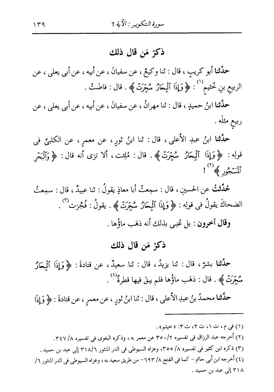 ذِكْرُ مَنْ قَالَ ذَلِكَ: حَدَّثَنَا أَبُو كُرَيْبٍ، قَالَ: ثنا وَكِيعٌ، عَنْ سُفْيَانَ، عَنْ أَبِيهِ، عَنْ أَبِي يَعْلَى، عَنْ رَبِيعِ بْنِ خُثَيْمٍ، {§وَإِذَا الْبِحَارُ سُجِّرَتْ} [التكوير: 6] قَالَ: فَاضَتْ حَدَّثَنَا ابْنُ حُمَيْدٍ، قَالَ: ثنا مِهْرَانُ، عَنْ سُفْيَانَ، عَنْ أَبِيهِ، عَنْ أَبِي يَعْلَى، عَنْ رَبِيعٍ، مِثْلَهُ