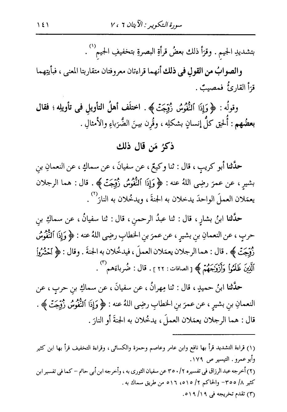 ذِكْرُ مَنْ قَالَ ذَلِكَ: حَدَّثَنَا أَبُو كُرَيْبٍ، قَالَ: ثنا وَكِيعٌ، عَنْ سُفْيَانَ، عَنْ سِمَاكٍ، عَنِ النُّعْمَانِ بْنِ بَشِيرٍ، عَنْ عُمَرَ، رِضَى اللَّهُ عَنْهُ {§وَإِذَا النُّفُوسُ زُوِّجَتْ} [التكوير: 7] قَالَ: هُمَا الرَّجُلَانِ يَعْمَلَانِ الْعَمَلَ الْوَاحِدَ يَدْخُلَانِ بِهِ الْجَنَّةَ، وَيَدْخُلَانِ بِهِ النَّارَ