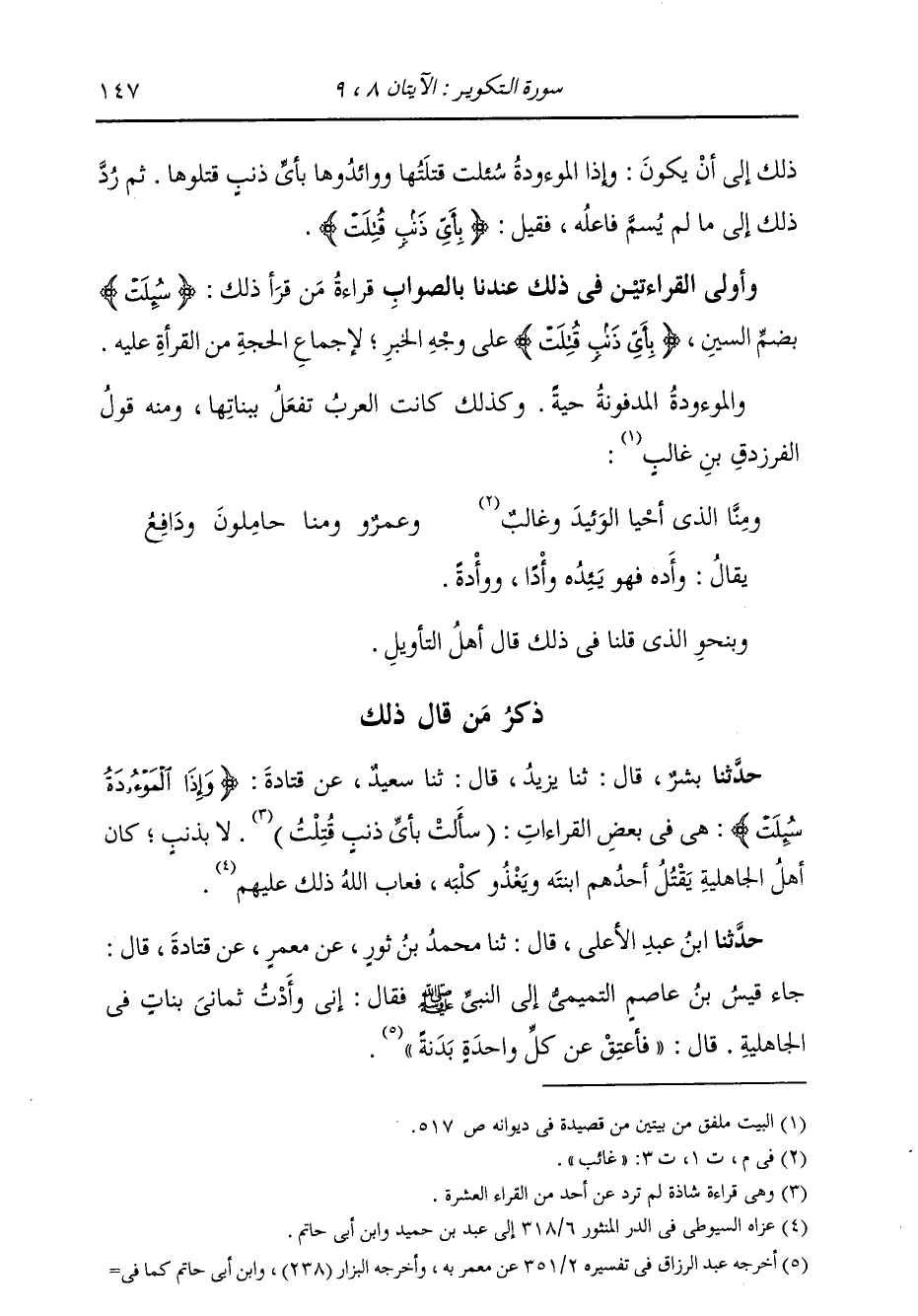 ذِكْرُ مَنْ قَالَ ذَلِكَ: حَدَّثَنَا بِشْرٌ، قَالَ: ثنا يَزِيدُ، قَالَ: ثنا سَعِيدٌ، عَنْ قَتَادَةَ، {§وَإِذَا الْمَوْءُودَةُ سُئِلَتْ} : هِيَ فِي بَعْضِ الْقِرَاءَاتِ: (سَأَلَتْ بِأَيِّ ذَنْبٍ قُتِلَتْ) لَا بِذَنْبٍ، كَانَ أَهْلُ الْجَاهِلِيَّةِ يَقْتُلُ أَحَدُهُمُ ابْنَتَهُ، وَيَغْذُو كَلْبَهُ، فَعَابَ اللَّهُ ذَلِكَ عَلَيْهِمْ