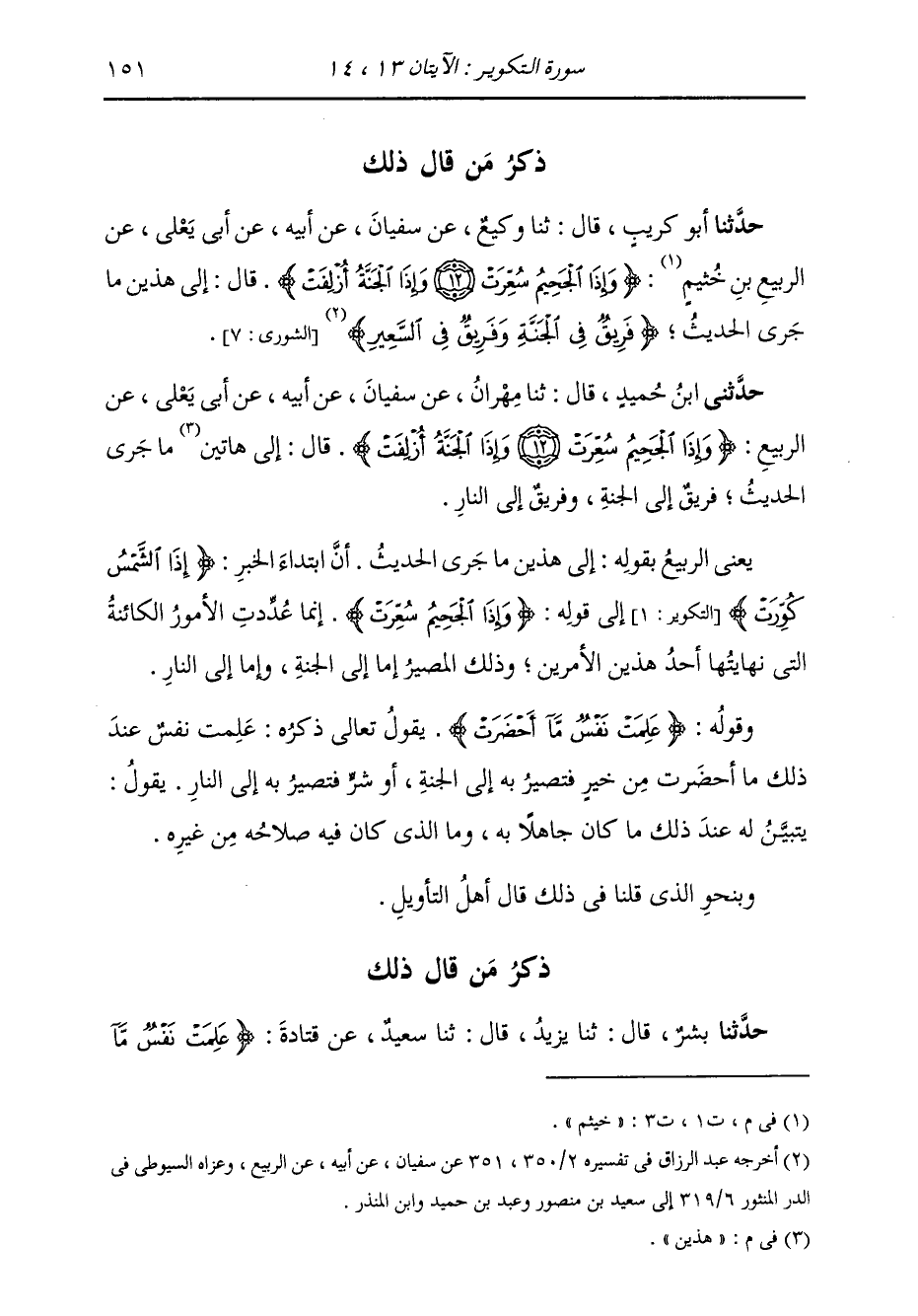 حَدَّثَنِي ابْنُ حُمَيْدٍ، قَالَ: ثنا مِهْرَانُ، عَنْ سُفْيَانَ، عَنْ أَبِيهِ، عَنْ أَبِي يَعْلَى، عَنِ الرَّبِيعِ {§وَإِذَا الْجَحِيمُ سُعِّرَتْ وَإِذَا الْجَنَّةُ أُزْلِفَتْ} [التكوير: 13] قَالَ: إِلَى هَذَيْنِ مَا جَرَى الْحَدِيثُ: فَرِيقٌ إِلَى الْجَنَّةِ، وَفَرِيقٌ إِلَى النَّارِ يَعْنِي الرَّبِيعُ بِقَوْلِهِ: إِلَى هَذَيْنِ مَا جَرَى الْحَدِيثُ أَنَّ ابْتِدَاءَ الْخَبَرِ {إِذَا الشَّمْسُ كُوِّرَتْ} [التكوير: 1] إِلَى قَوْلِهِ: {وَإِذَا الْجَحِيمُ سُعِّرَتْ} [التكوير: 12] إِنَّمَا عُدِّدَتِ الْأُمُورُ الْكَائِنَةُ الَّتِي نِهَايَتُهَا أَحَدُ هَذَيْنِ الْأَمْرَيْنِ، وَذَلِكَ الْمَصِيرُ إِمَّا إِلَى الْجَنَّةِ، وَإِمَّا إِلَى النَّارِ