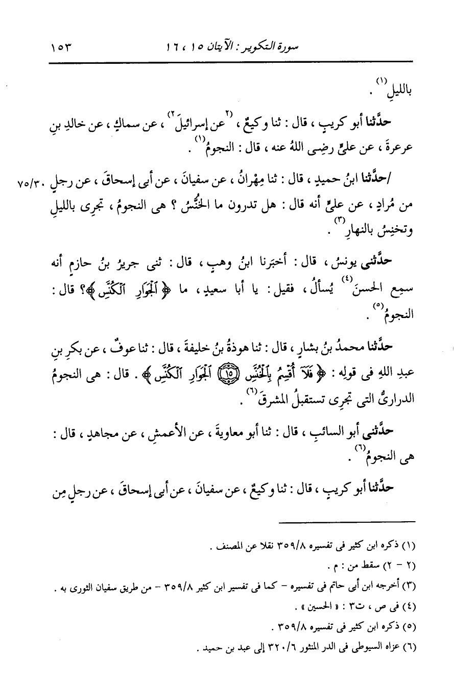 حَدَّثَنَا أَبُو كُرَيْبٍ، قَالَ: ثنا وَكِيعٌ، عَنْ سُفْيَانَ، عَنْ أَبِي إِسْحَاقَ، عَنْ رَجُلٍ، مِنْ -[154]- مُرَادٍ، عَنْ عَلِيِّ بْنِ أَبِي طَالِبٍ رَضِي اللَّهُ عَنْهُ {فَلَا أُقْسِمُ بِالْخُنَّسِ الْجِوَارِ §الْكُنَّسِ} [التكوير: 16] قَالَ: يَعْنِي النُّجُومَ، تَكْنِسُ بِالنَّهَارِ، وَتَبْدُو بِاللَّيْلِ