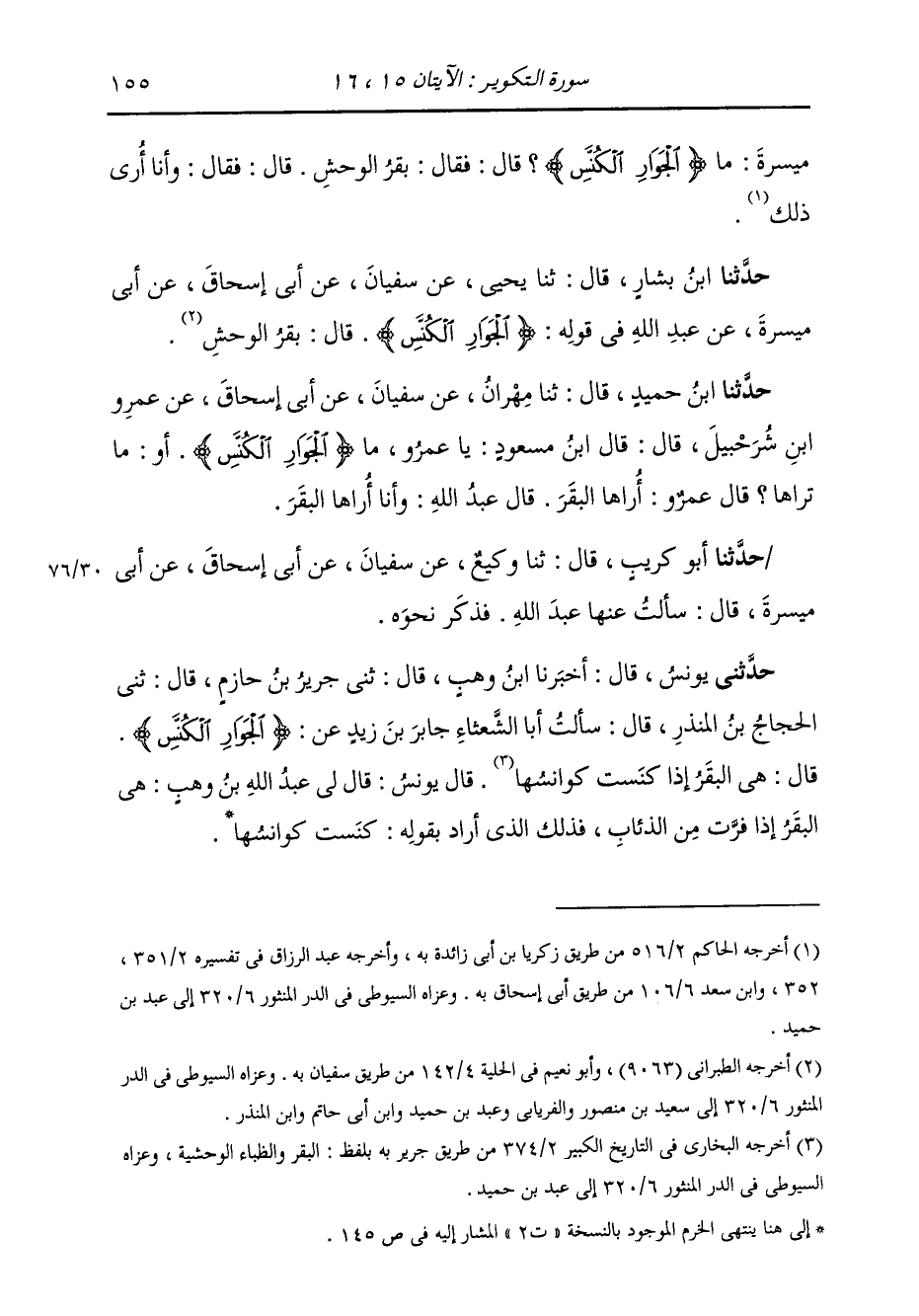 حَدَّثَنَا ابْنُ حُمَيْدٍ، قَالَ: ثنا مِهْرَانُ، عَنْ سُفْيَانَ، عَنْ أَبِي إِسْحَاقَ، عَنْ عَمْرِو بْنِ شُرَحْبِيلَ، قَالَ: قَالَ ابْنُ مَسْعُودٍ: يَا عَمْرُو مَا §الْجَوَارِي الْكُنَّسِ، أَوْ مَا تَرَاهَا؟ قَالَ عَمْرٌو: أُرَاهَا الْبَقَرَ، قَالَ عَبْدُ اللَّهِ: وَأَنَا أُرَاهَا الْبَقَرَ حَدَّثَنَا أَبُو كُرَيْبٍ، قَالَ: ثنا وَكِيعٌ، عَنْ سُفْيَانَ، عَنْ أَبِي إِسْحَاقَ، عَنْ أَبِي مَيْسَرَةَ، قَالَ: سَأَلْتُ عَنْهَا عَبْدَ اللَّهِ، فَذَكَرَ نَحْوَهُ