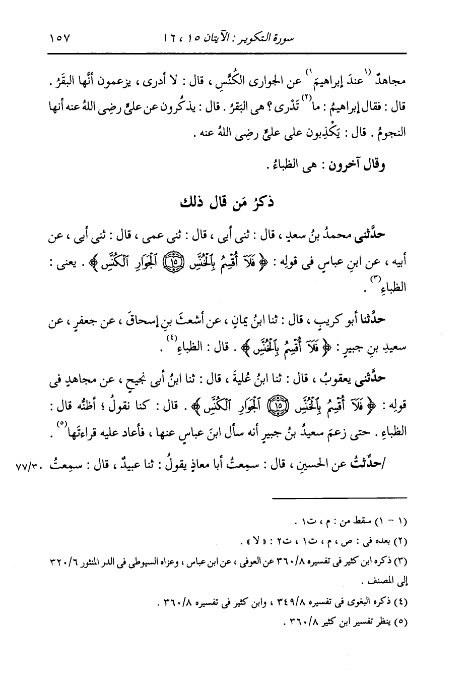 ذِكْرُ مَنْ قَالَ ذَلِكَ: حَدَّثَنِي مُحَمَّدُ بْنُ سَعْدٍ، قَالَ: ثني أَبِي، قَالَ: ثني عَمِّي، قَالَ: ثني أَبِي، عَنْ أَبِيهِ، عَنِ ابْنِ عَبَّاسٍ، فِي قَوْلِهِ: {§فَلَا أُقْسِمُ بِالْخُنَّسِ الْجِوَارِ الْكُنَّسِ} [التكوير: 16] يَعْنِي: الظِّبَاءَ