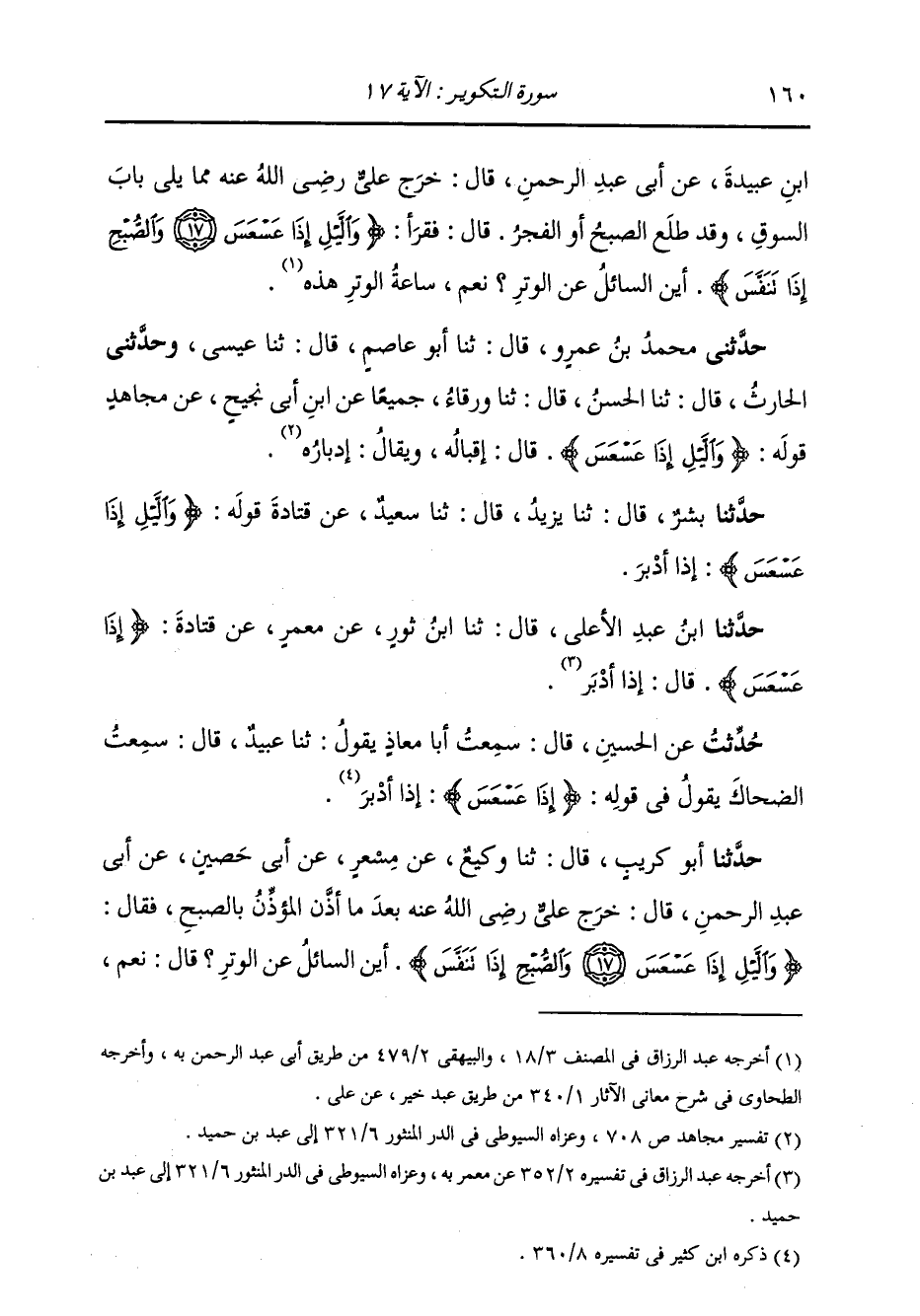 حَدَّثَنَا أَبُو كُرَيْبٍ، قَالَ: ثنا وَكِيعٌ، عَنْ مِسْعَرٍ، عَنْ أَبِي حُصَيْنٍ، عَنْ أَبِي عَبْدِ الرَّحْمَنِ، قَالَ: خَرَجَ عَلِيٌّ عَلَيْهِ السَّلَامُ بَعْدَ مَا أَذَّنَ الْمُؤَذِّنُ بِالصُّبْحِ، فَقَالَ: {§وَاللَّيْلِ إِذَا عَسْعَسَ وَالصُّبْحِ إِذَا تَنَفَّسَ} [التكوير: 18] أَيْنَ السَّائِلُ عَنِ الْوِتْرِ؟ قَالَ: نِعْمَ -[161]- سَاعَةُ الْوِتْرِ هَذِهِ