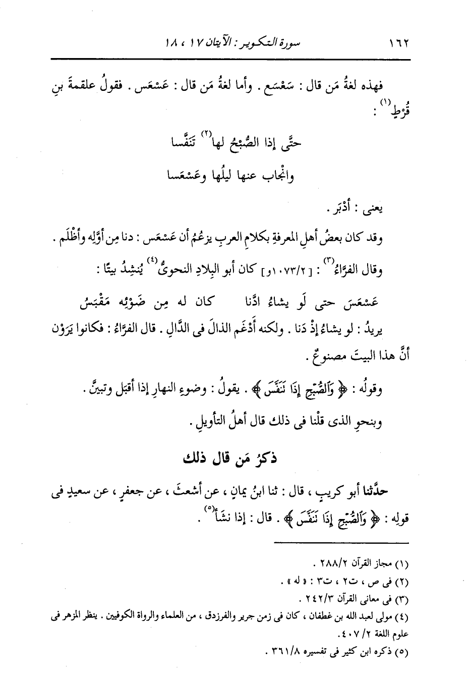 ذِكْرُ مَنْ قَالَ ذَلِكَ: حَدَّثَنَا أَبُو كُرَيْبٍ، قَالَ: ثنا ابْنُ يَمَانٍ، عَنْ أَشْعَثَ، عَنْ جَعْفَرٍ، عَنْ سَعِيدٍ، فِي قَوْلِهِ: {§وَالصُّبْحِ إِذَا تَنَفَّسَ} [التكوير: 18] قَالَ: إِذَا نَشَأَ