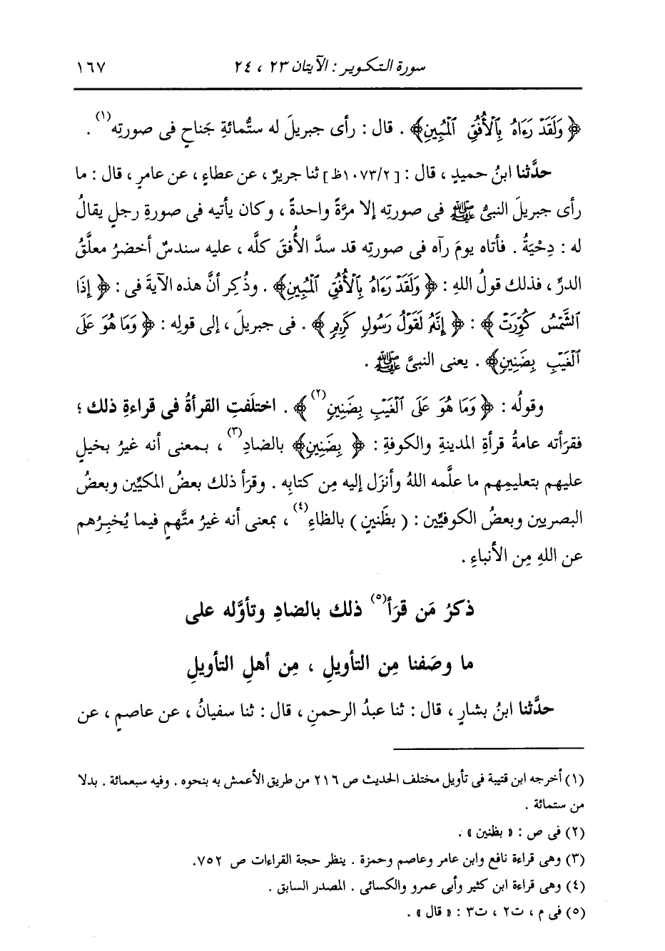حَدَّثَنَا ابْنُ بَشَّارٍ، قَالَ: ثنا عَبْدُ الرَّحْمَنِ، قَالَ: ثنا سُفْيَانُ، عَنْ عَاصِمٍ، عَنْ -[168]- زِرٍّ، (§وَمَا هُوَ عَلَى الْغَيْبِ بِظَنِينٍ) قَالَ: الظَّنِينُ: الْمُتَّهَمُ. وَفِي قِرَاءَتِكُمْ: {بِضَنِينٍ} [التكوير: 24] وَالضَّنِينُ: الْبَخِيلُ، وَالْغَيْبُ: الْقُرْآنُ