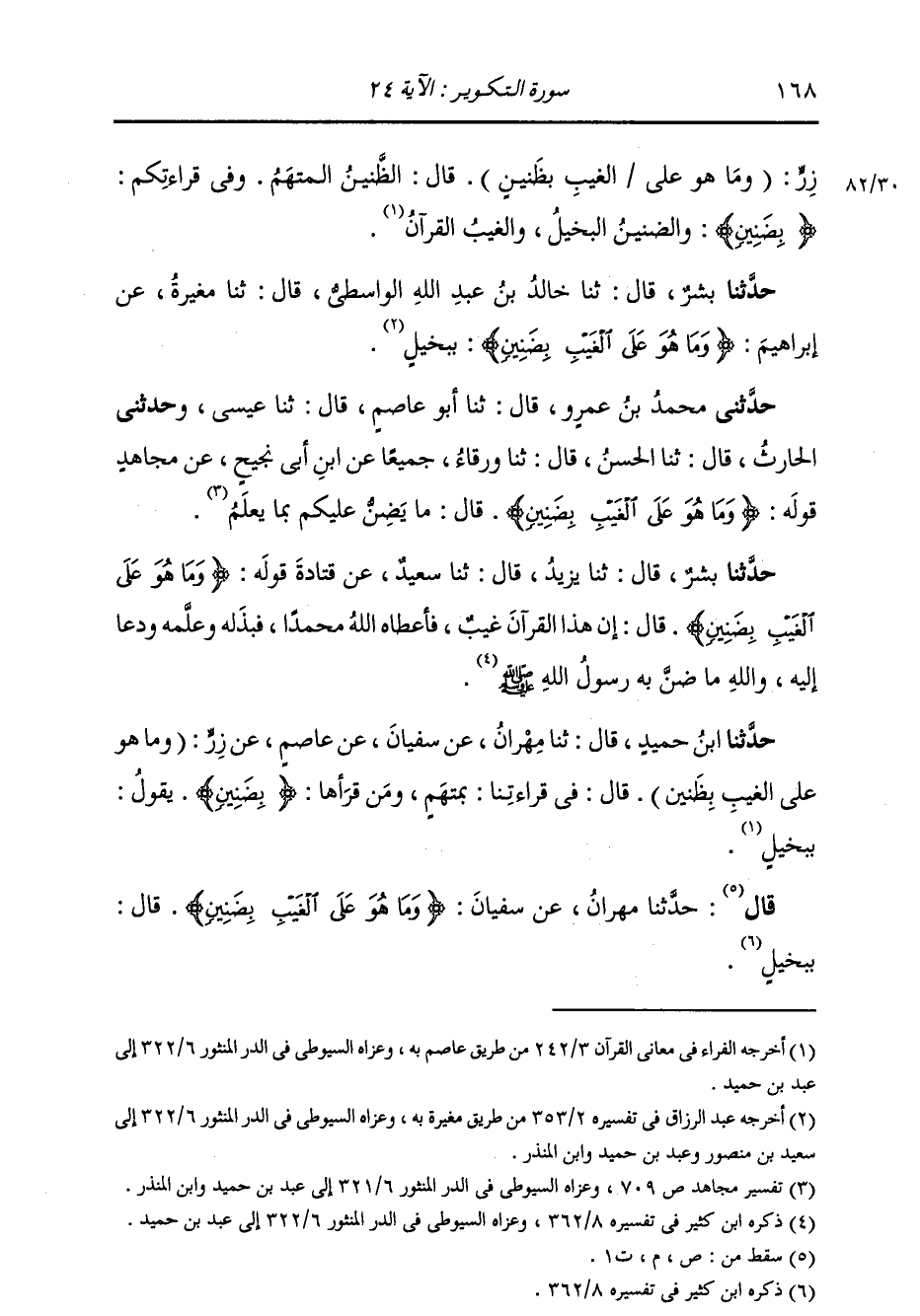 حَدَّثَنَا بِشْرٌ، قَالَ: ثنا خَالِدُ بْنُ عَبْدِ اللَّهِ الْوَاسِطِيُّ، قَالَ: ثنا مُغِيرَةُ، عَنْ إِبْرَاهِيمَ، {§وَمَا هُوَ عَلَى الْغَيْبِ بِضَنِينٍ} [التكوير: 24] بِبَخِيلٍ