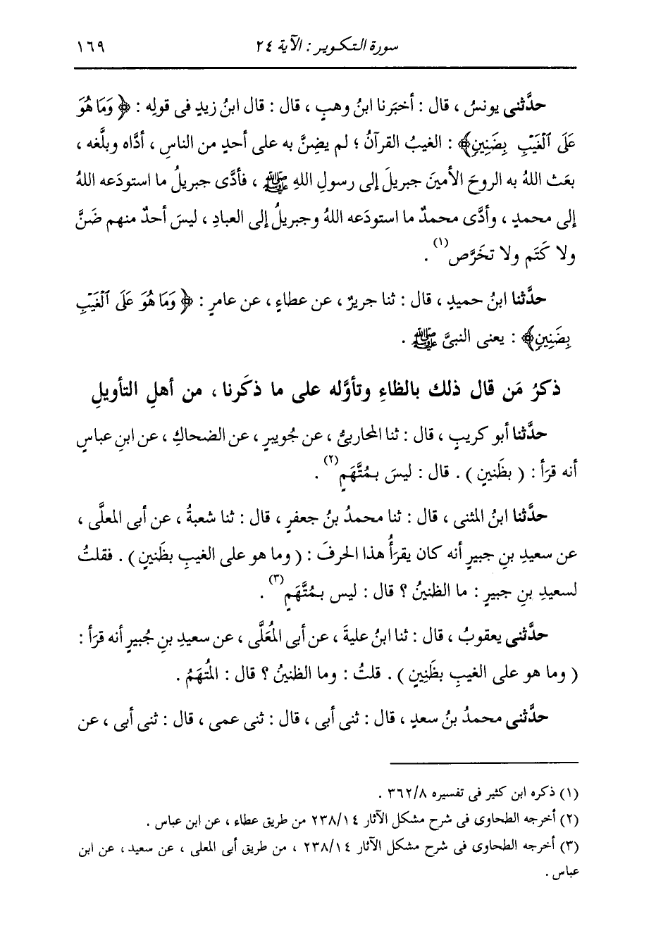 حَدَّثَنَا ابْنُ حُمَيْدٍ، قَالَ: ثنا جَرِيرٌ، عَنْ عَطَاءٍ، عَنْ عَامِرٍ، {§وَمَا هُوَ عَلَى الْغَيْبِ بِضَنِينٍ} [التكوير: 24] يَعْنِي النَّبِيَّ صَلَّى اللهُ عَلَيْهِ وَسَلَّمَ ذِكْرُ مَنْ قَالَ ذَلِكَ بِالظَّاءِ، وَتَأَوَّلَهُ عَلَى مَا ذَكَرْنَا مِنْ أَهْلِ الْتَأْوِيلِ