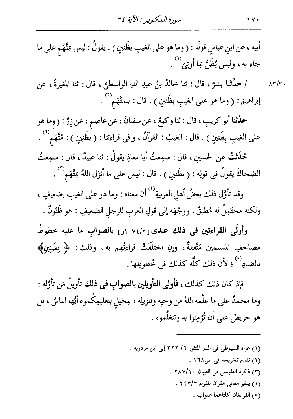 حُدِّثْتُ عَنِ الْحُسَيْنِ، قَالَ: سَمِعْتُ أَبَا مُعَاذٍ، يَقُولُ: ثنا عُبَيْدٌ، قَالَ: سَمِعْتُ الضَّحَّاكَ، يَقُولُ فِي قَوْلِهِ: (§بِظَنِينٍ) قَالَ: لَيْسَ عَلَى مَا أَنْزَلَ اللَّهُ بِمُتَّهَمٍ وَقَدْ تَأَوَّلَ ذَلِكَ بَعْضُ أَهْلِ الْعَرَبِيَّةِ أَنَّ مَعْنَاهُ: وَمَا هُوَ عَلَى الْغَيْبِ بِضَعِيفٍ، وَلَكِنَّهُ مُحْتَمِلٌ لَهُ مُطِيقٌ، وَوَجَّهَهُ إِلَى قَوْلِ الْعَرَبِ لِلرَّجُلِ الضَّعِيفِ: هُوَ ظَنُونٌ وَأَوْلَى الْقِرَاءَتَيْنِ فِي ذَلِكَ عِنْدِي بِالصَّوَابِ: مَا عَلَيْهِ خُطُوطُ مَصَاحِفِ الْمُسْلِمِينَ مُتَّفِقَةٌ، وَإِنِ اخْتَلَفَتْ قِرَاءَتُهُمْ بِهِ، وَذَلِكَ {بِضَنِينٍ} [التكوير: 24] بِالضَّادِ، لِأَنَّ ذَلِكَ كُلَّهُ كَذَلِكَ فِي خُطُوطِهَا فَإِذَا كَانَ ذَلِكَ كَذَلِكَ، فَأَوْلَى الْتَأْوِيلَيْنِ بِالصَّوَابِ فِي ذَلِكَ تَأْوِيلُ مَنْ تَأَوَّلَهُ: وَمَا مُحَمَّدٌ عَلَى مَا عَلَّمَهُ اللَّهُ مِنْ وَحْيِهِ وَتَنْزِيلِهِ بِبَخِيلٍ بِتَعْلِيمُكُمُوهُ أَيُّهَا النَّاسُ، بَلْ هُوَ حَرِيصٌ عَلَى أَنْ تُؤْمِنُوا بِهِ وَتَتَعَلَّمُوهُ