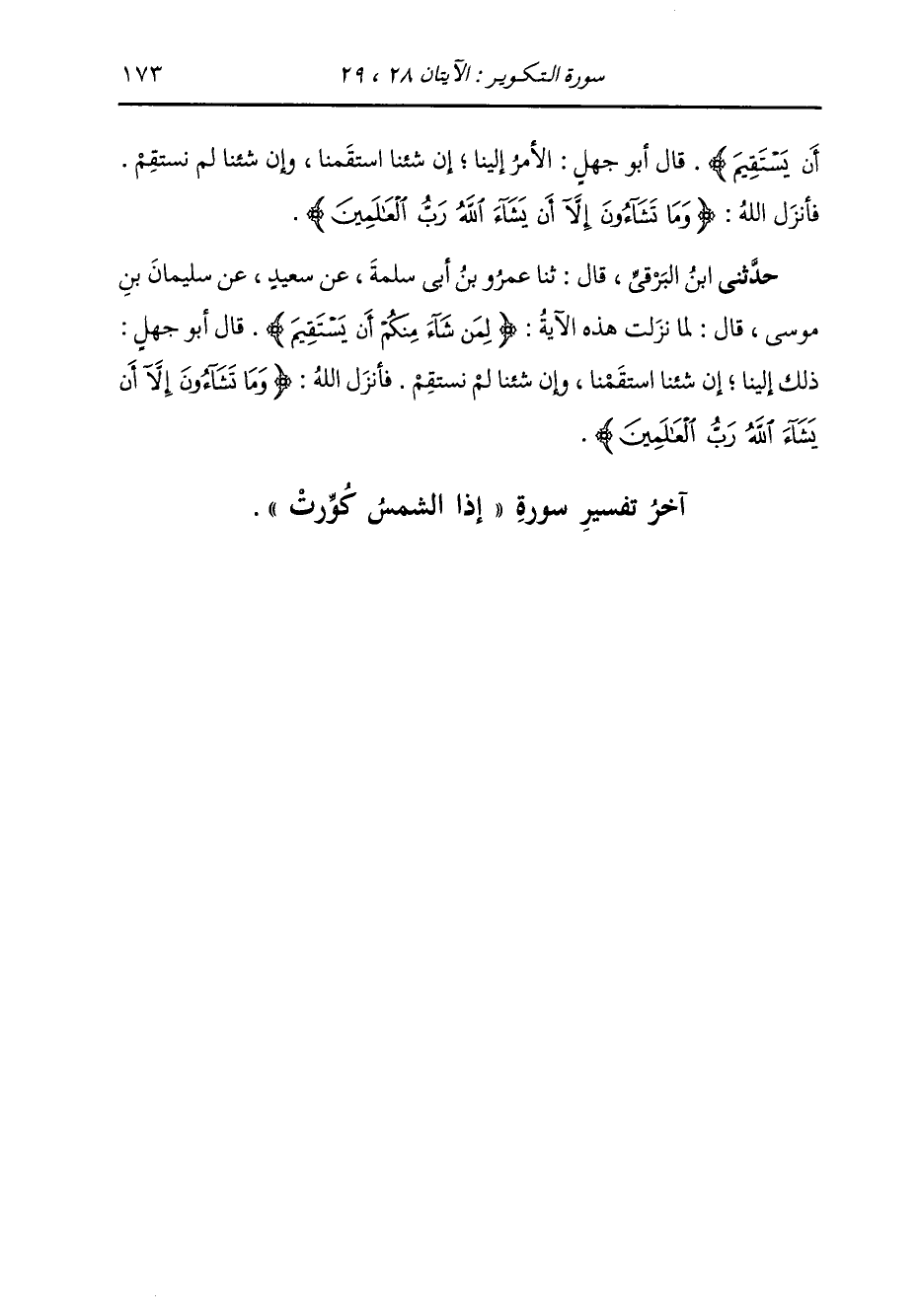 حَدَّثَنِي ابْنُ الْبَرْقِيِّ، قَالَ: ثنا عَمْرُو بْنُ أَبِي سَلَمَةَ، عَنْ سَعِيدٍ، عَنْ سُلَيْمَانَ بْنِ مُوسَى، قَالَ: §لَمَّا نَزَلَتْ هَذِهِ الْآيَةُ: {لِمَنْ شَاءَ مِنْكُمْ أَنْ يَسْتَقِيمَ} [التكوير: 28] قَالَ أَبُو جَهْلٍ: ذَلِكَ إِلَيْنَا، إِنْ شِئْنَا اسْتَقَمْنَا، وَإِنْ شِئْنَا لَمْ نَسْتَقِمْ، فَأَنْزَلَ اللَّهُ: {وَمَا تَشَاءُونَ إِلَّا أَنْ يَشَاءَ اللَّهُ رَبُّ الْعَالَمِينَ}