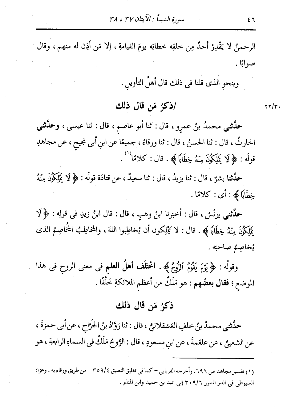 ذِكْرُ مَنْ قَالَ ذَلِكَ: حَدَّثَنِي مُحَمَّدُ بْنُ عَمْرٍو، قَالَ: ثنا أَبُو عَاصِمٍ، قَالَ: ثنا عِيسَى، وَحَدَّثَنِي الْحَارِثُ، قَالَ: ثنا الْحَسَنُ، قَالَ: ثنا وَرْقَاءُ، جَمِيعًا عَنِ ابْنِ أَبِي نَجِيحٍ، عَنْ مُجَاهِدٍ، قَوْلُهُ: {§لَا يَمْلِكُونَ مِنْهُ خِطَابًا} [النبأ: 37] قَالَ: كَلَامًا