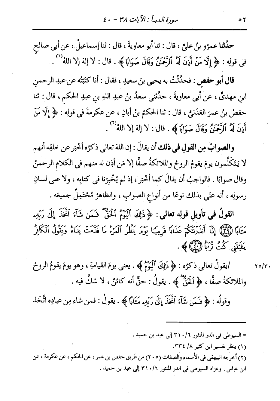 حَدَّثَنِي سَعْدُ بْنُ عَبْدِ اللَّهِ بْنِ عَبْدِ الْحَكَمِ، قَالَ: ثنا حَفْصُ بْنُ عُمَرَ الْعَدَنِيُّ، قَالَ: ثنا الْحَكَمُ بْنُ أَبَانَ، عَنْ عِكْرِمَةَ، فِي قَوْلِهِ: {إِلَّا مَنْ أَذِنَ لَهُ الرَّحْمَنُ §وَقَالَ صَوَابًا} [النبأ: 38] قَالَ: لَا إِلَهَ إِلَّا اللَّهُ وَالصَّوَابُ مِنَ الْقَوْلِ فِي ذَلِكَ: أَنْ يُقَالَ: إِنَّ اللَّهَ تَعَالَى ذِكْرُهُ أَخْبَرَ عَنْ خَلْقِهِ أَنَّهُمْ لَا يَتَكَلَّمُونَ يَوْمَ يَقُومُ الرُّوحُ وَالْمَلَائِكَةُ صَفًّا، إِلَّا مَنْ أَذِنَ لَهُ مِنْهُمْ فِي الْكَلَامِ الرَّحْمَنُ، وَقَالَ صَوَابًا، فَالْوَاجِبُ أَنْ يُقَالَ كَمَا أَخْبَرَ إِذْ لَمْ يُخْبِرْنَا فِي كِتَابِهِ، وَلَا عَلَى لِسَانِ رَسُولِهِ، أَنَّهُ عَنَى بِذَلِكَ نَوْعًا مِنْ أَنْوَاعِ الصَّوَابِ، وَالظَّاهِرُ مُحْتَمِلٌ جَمِيعَهُ