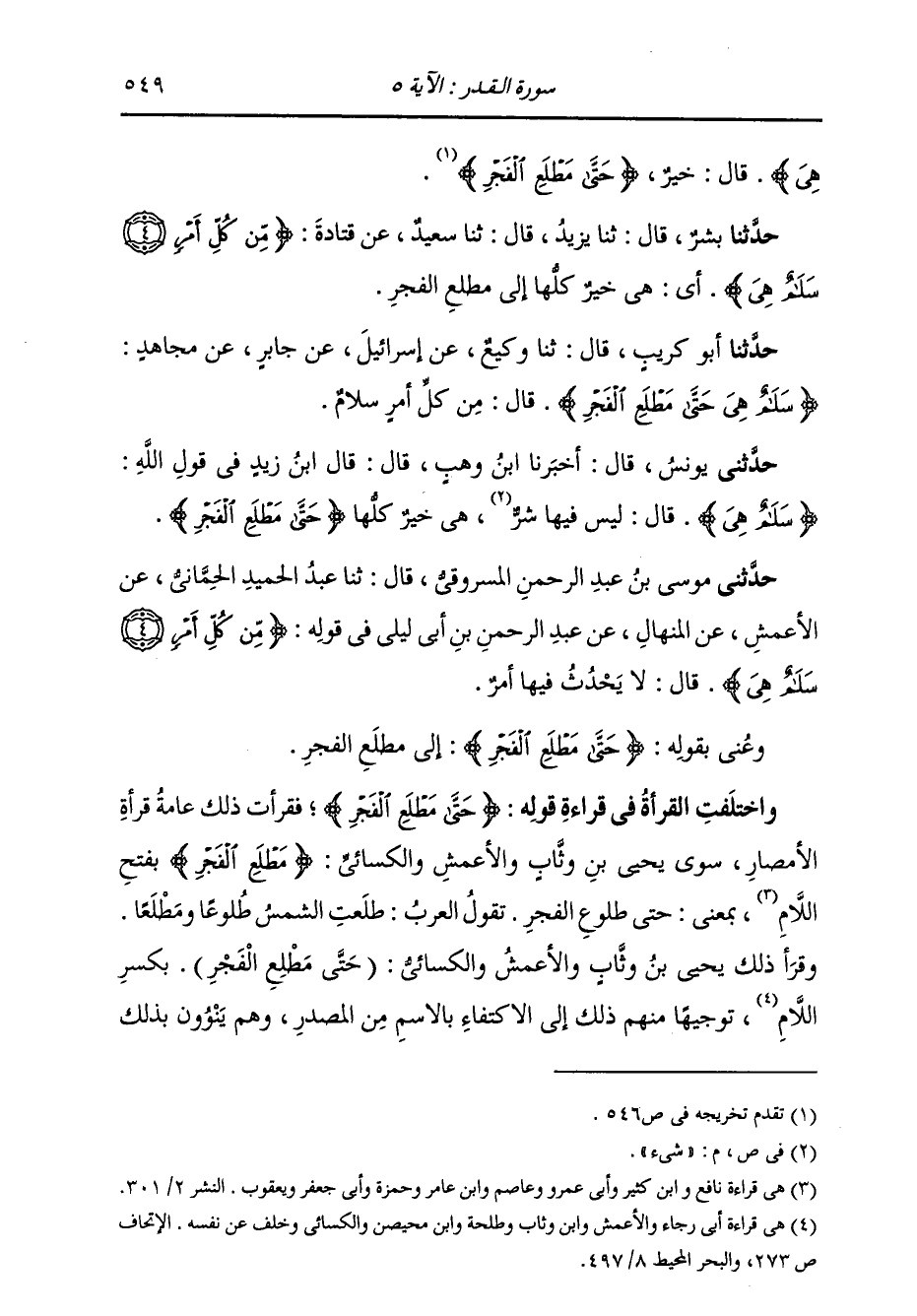 حَدَّثَنِي مُوسَى بْنُ عَبْدِ الرَّحْمَنِ الْمَسْرُوقِيُّ، قَالَ: ثنا عَبْدُ الْحَمِيدِ الْحِمَّانِيُّ، عَنِ الْأَعْمَشِ، عَنِ الْمِنْهَالِ، عَنْ عَبْدِ الرَّحْمَنِ بْنِ أَبِي لَيْلَى، فِي قَوْلِهِ: {§مِنْ كُلِّ أَمْرٍ سَلَامٌ هِيَ} [القدر: 5] قَالَ: «لَا يَحْدُثُ فِيهَا أَمْرٌ» وَعُنِيَ بِقَوْلِهِ: {حَتَّى مَطْلَعِ الْفَجْرِ} [القدر: 5] إِلَى مَطْلَعِ الْفَجْرِ، وَاخْتَلَفَتِ الْقُرَّاءُ فِي قِرَاءَةِ قَوْلِهِ: {حَتَّى مَطْلَعِ الْفَجْرِ} [القدر: 5] فَقَرَأَتْ ذَلِكَ عَامَّةُ قُرَّاءِ الْأَمْصَارِ، سِوَى يَحْيَى بْنِ وَثَّابٍ وَالْأَعْمَشِ وَالْكِسَائِيِّ {مَطْلَعِ الْفَجْرِ} [القدر: 5] بِفَتْحِ اللَّامِ، بِمَعْنَى: حَتَّى طُلُوعِ الْفَجْرِ؛ تَقُولُ الْعَرَبُ: طَلَعَتِ الشَّمْسُ طُلُوعًا وَمَطْلَعًا. وَقَرَأَ ذَلِكَ يَحْيَى بْنُ وَثَّابٍ وَالْأَعْمَشُ وَالْكِسَائِيُّ: (حَتَّى مَطْلِعِ الْفَجْرِ) بِكَسْرِ اللَّامِ، تَوْجِيهًا مِنْهُمْ ذَلِكَ إِلَى الِاكْتِفَاءِ بِالِاسْمِ مِنَ الْمَصْدَرِ، وَهُمْ يَنْوُونَ بِذَلِكَ